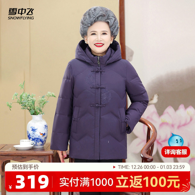 雪中飞2025冬新款中式暗花羽绒服盘扣奶奶装保暖宽松连帽中老年