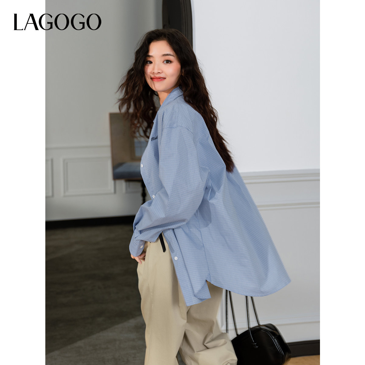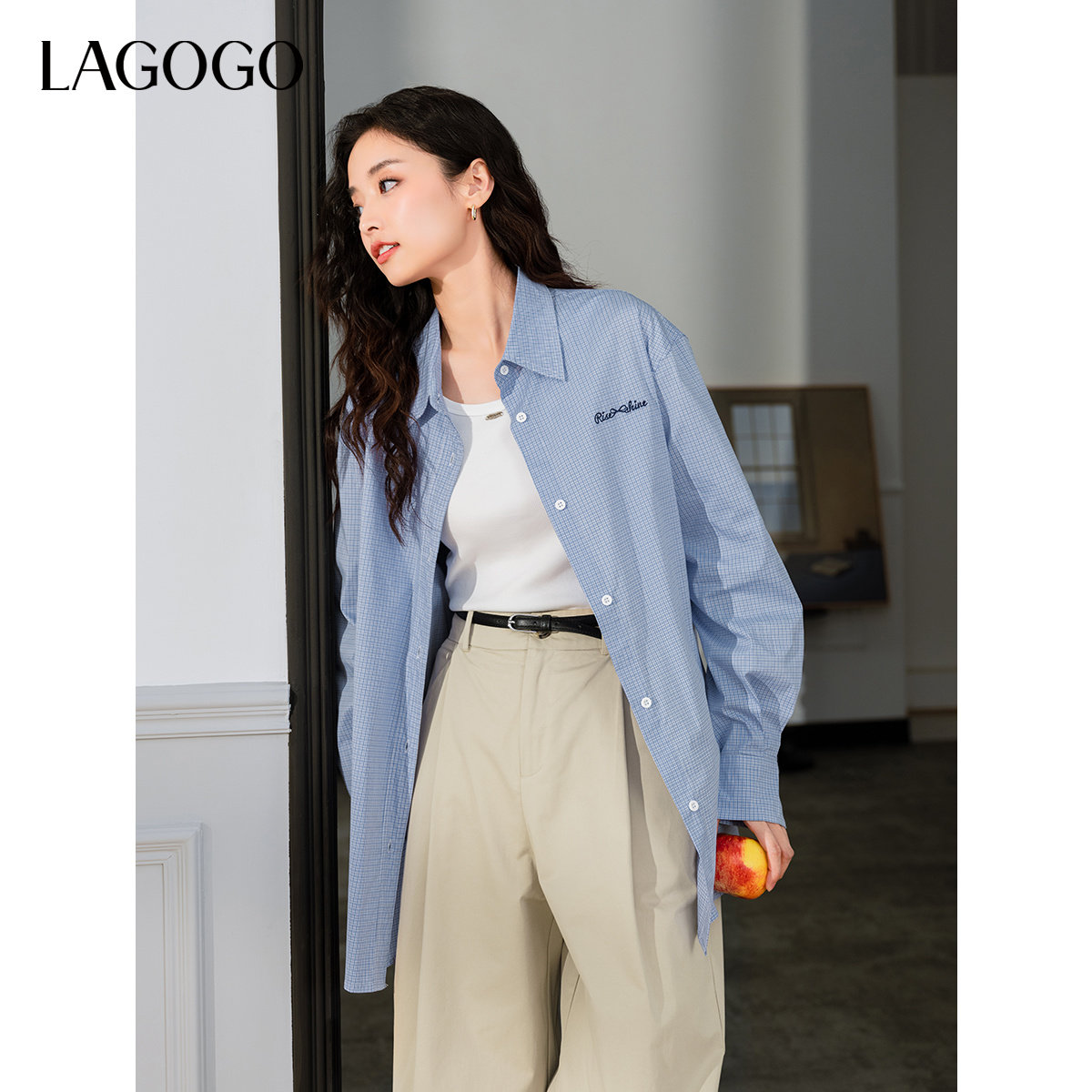 LAGOGO蓝色格子条纹衬衫女拉谷谷2025秋冬新款轻薄宽松上衣外套