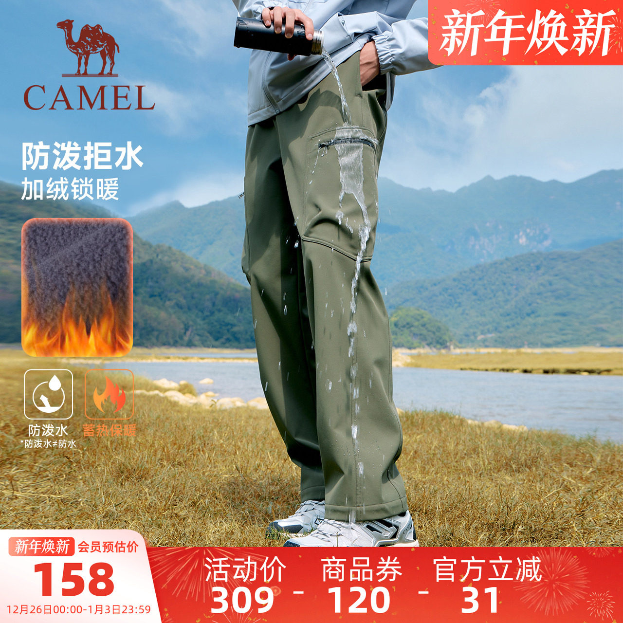 【防泼水】骆驼运动工装加绒裤男冬季直筒伞兵软壳裤户外暖登山裤