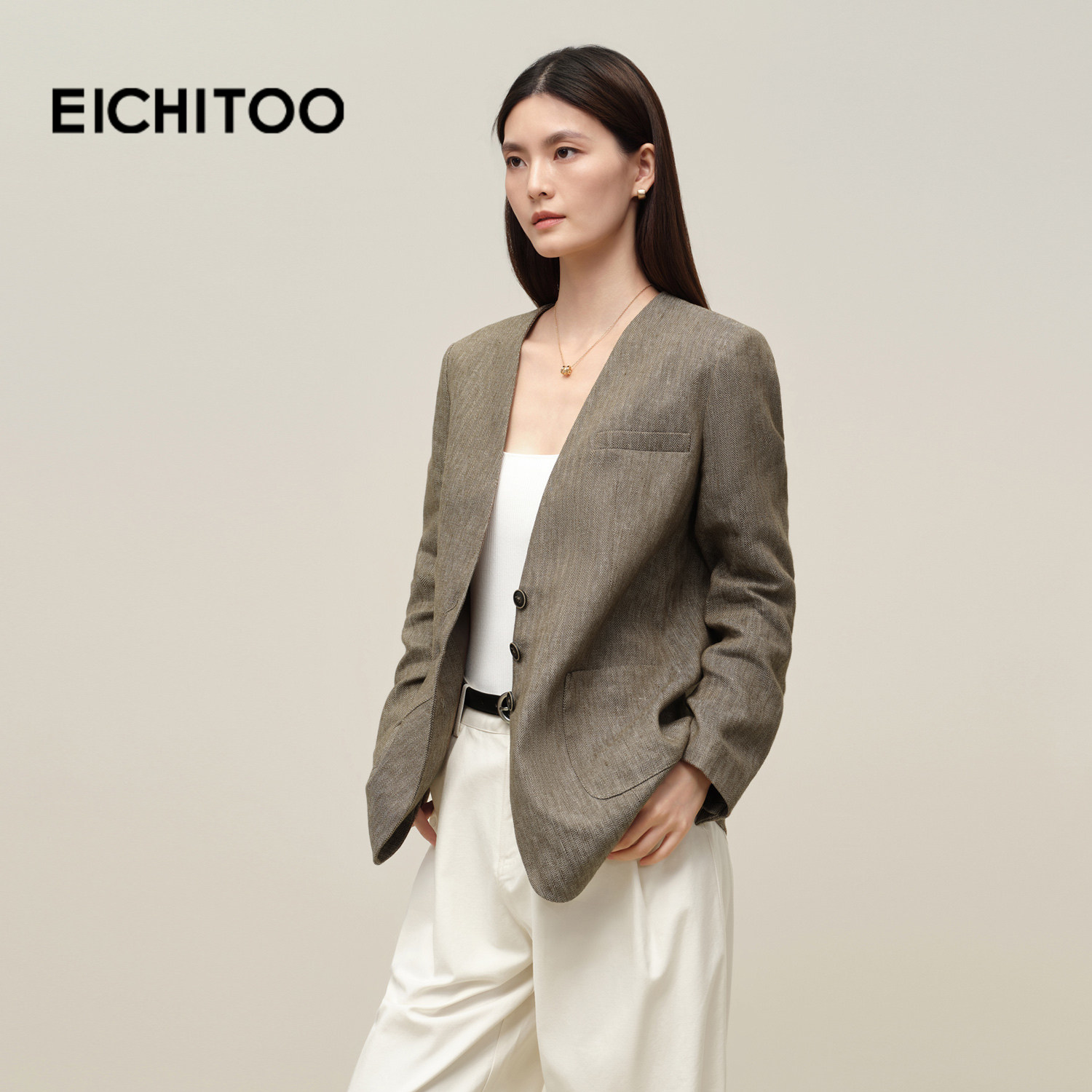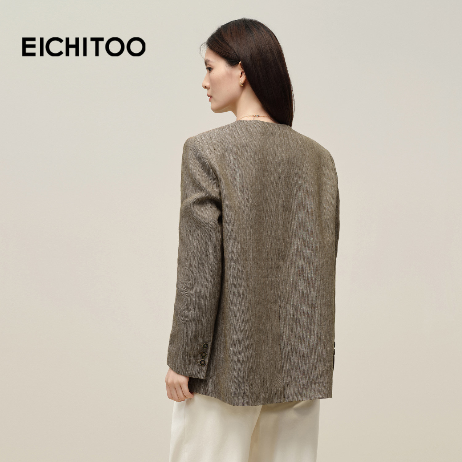 爱居兔混色亚麻仿牛仔无领西装西服女2025年秋季新款通勤垫肩外套