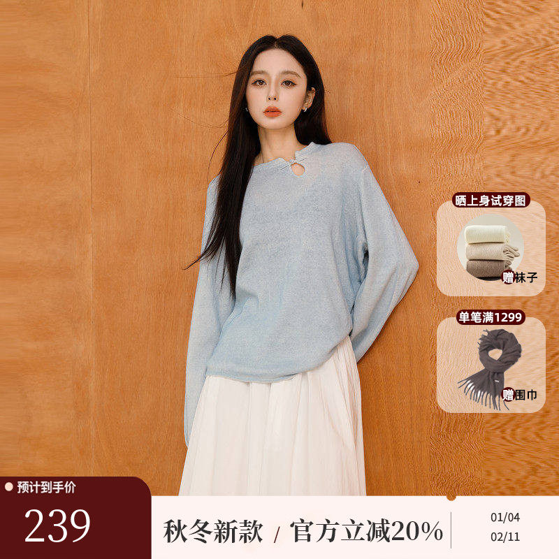 AIRIQI秋季新款新中式设计感水滴领落肩亚麻长款毛衫女AX43MS016