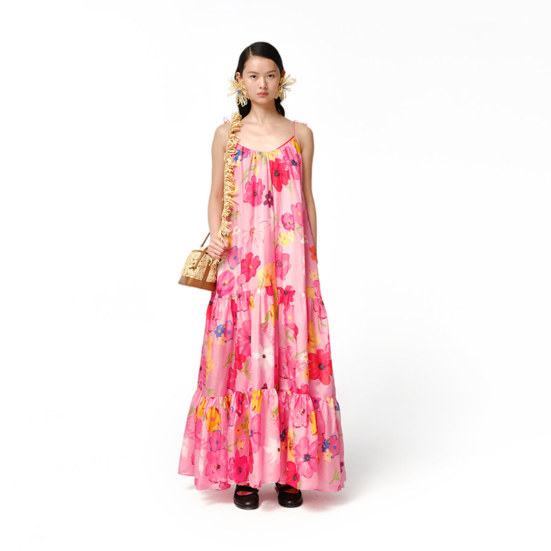 全球花【伯爵公主】大码法式蕾丝拼接粉色吊带裙甜美风显瘦连衣裙