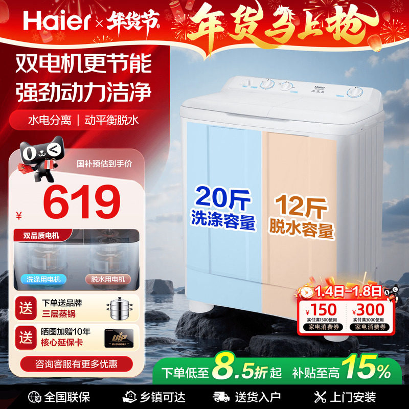 [大容量双缸]海尔双缸洗衣机半自动家用双桶10/15公斤洗脱旗舰