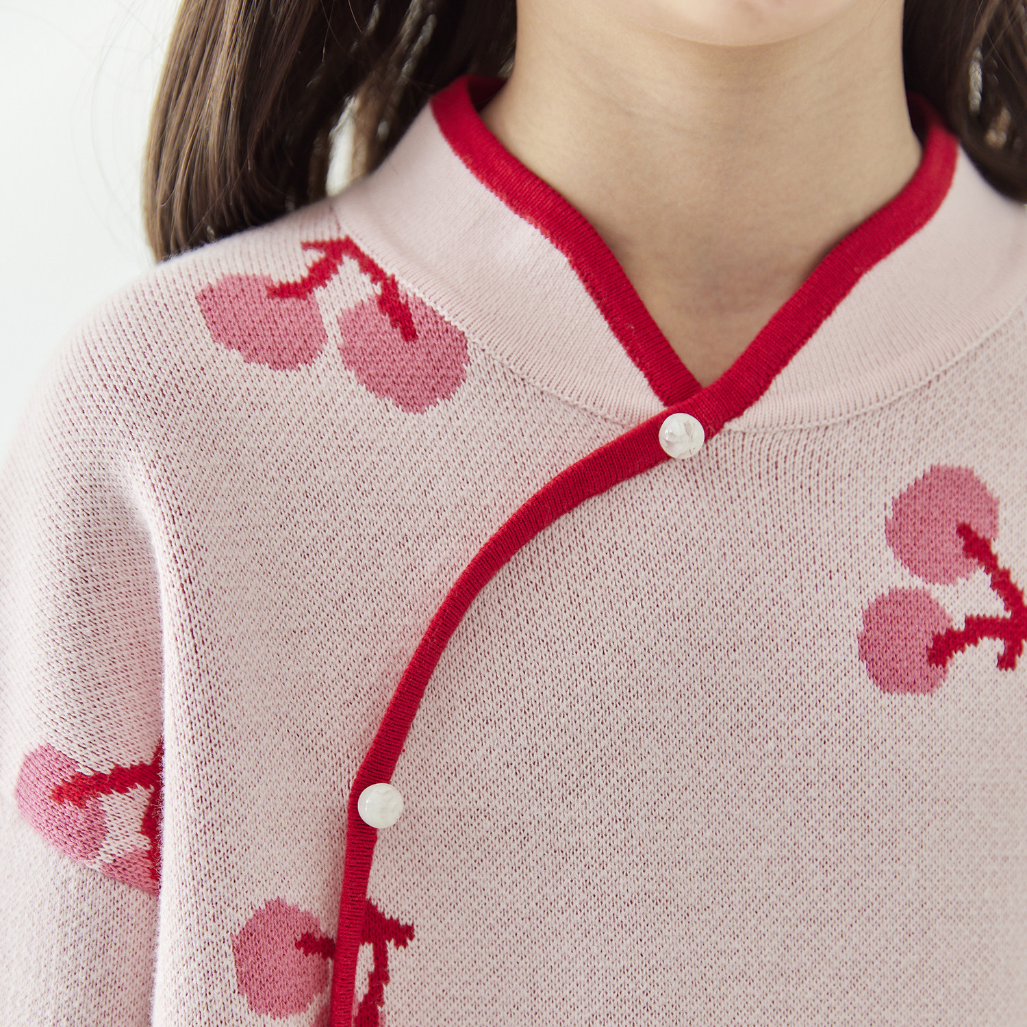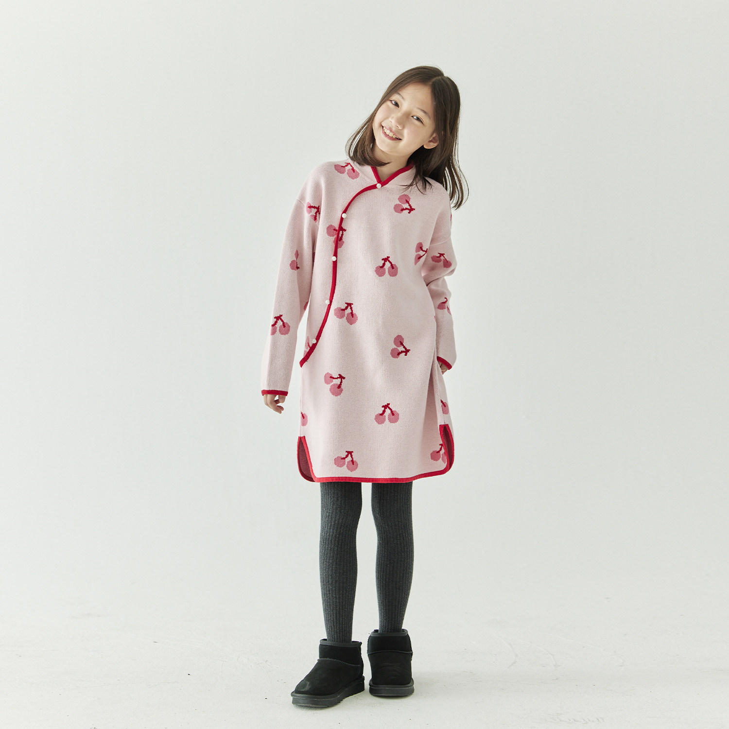 棵初2025年冬季新款女童新中式全棉针织旗袍裙甜美俏皮樱桃连衣裙