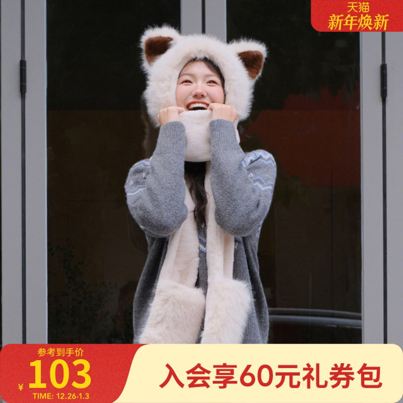 热风2025年冬季新款女士可爱耳朵三合一围巾