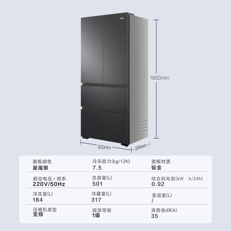 【双系统新品】海尔小红花501L法式多门风冷无霜家用节能电冰箱