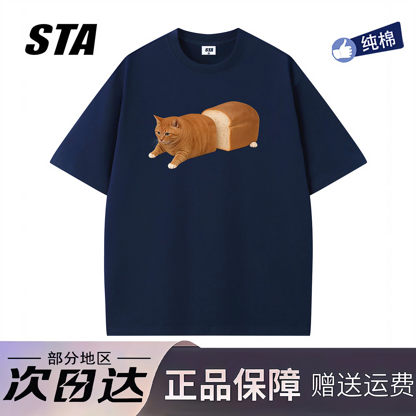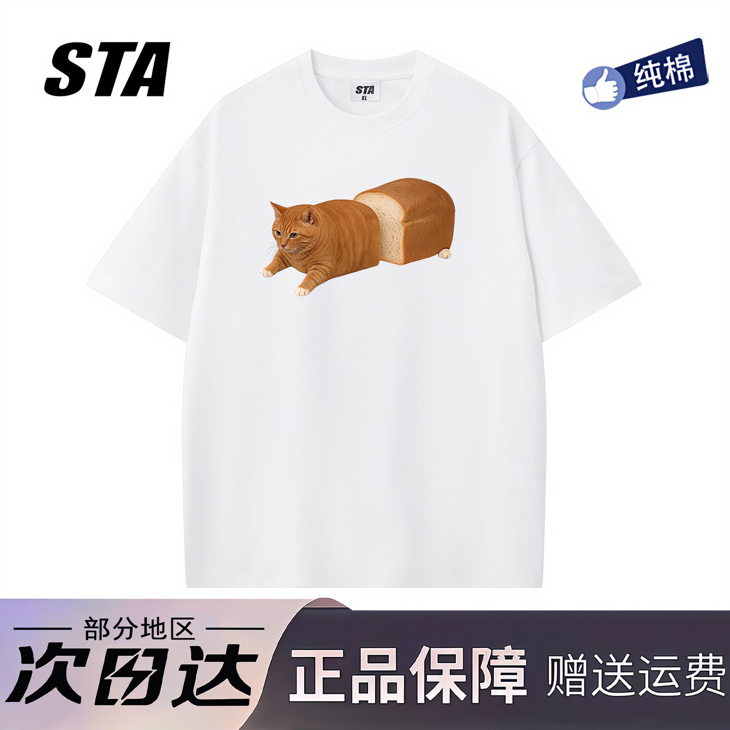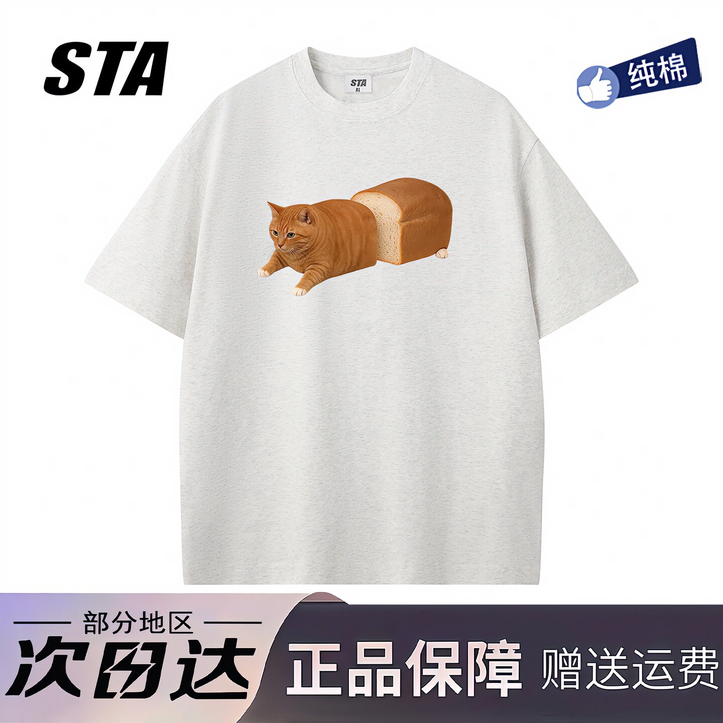 STA旗舰店趣味搞怪面包猫咪印花短袖男女美式潮牌高街重磅纯棉t恤