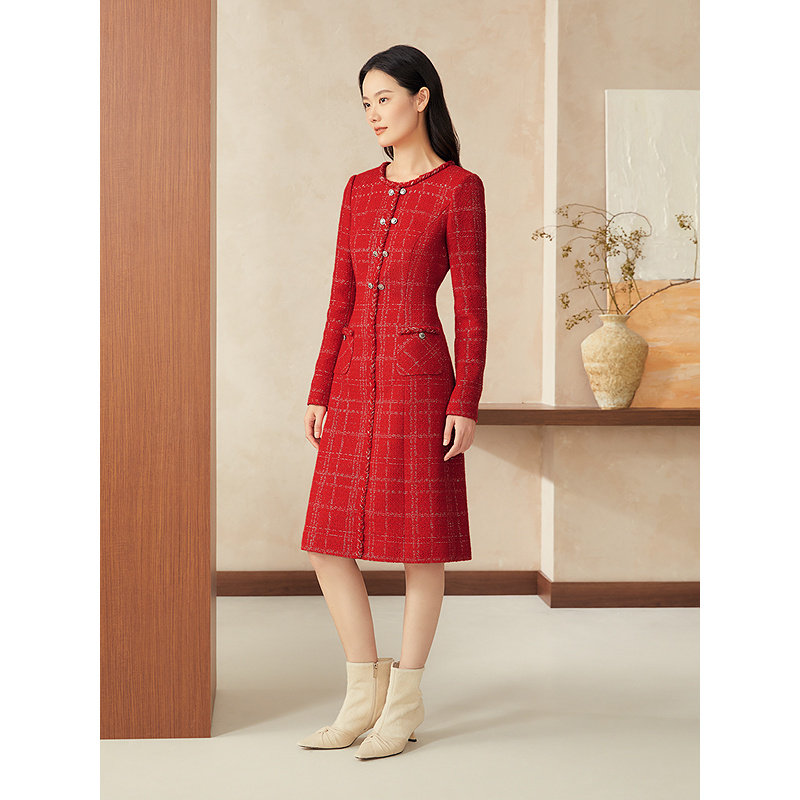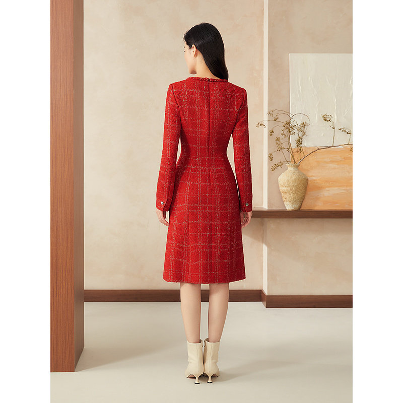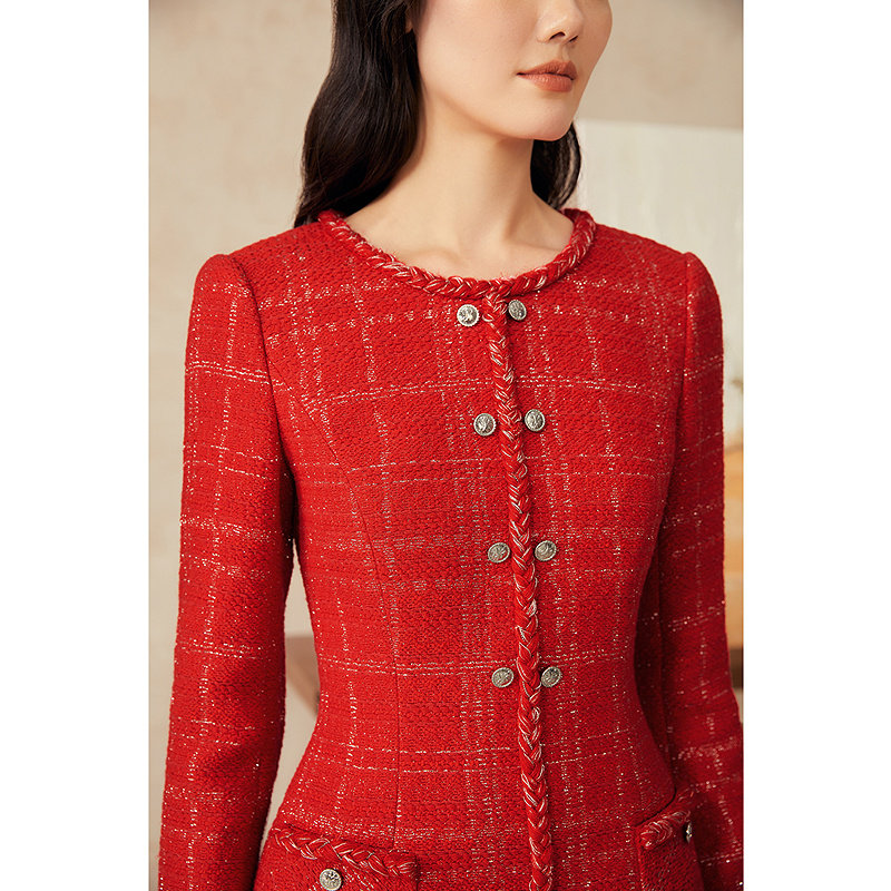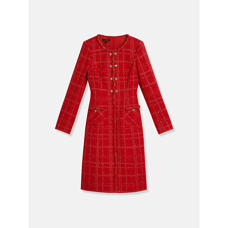 YINER音儿女装春季中国红法式小香风花纱亮丝收腰连衣裙