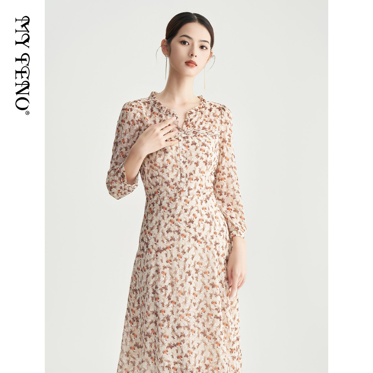 马天奴纯色花边领印花雪纺连衣裙收腰修身坠感气质长裙春夏款