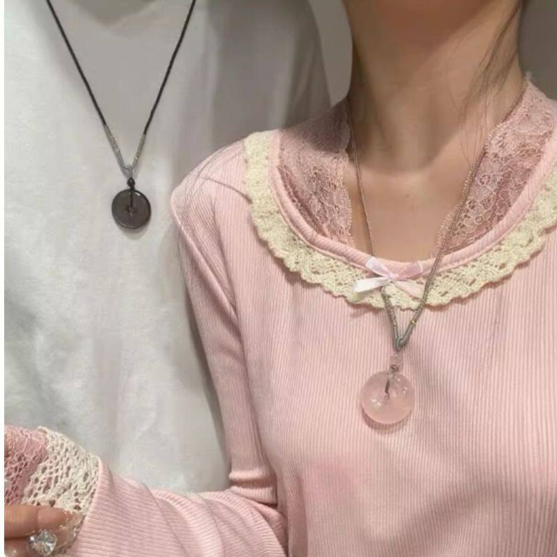 天然粉水晶银曜石平安扣情侣款项链一对情侣粉水晶平安扣项链吊坠