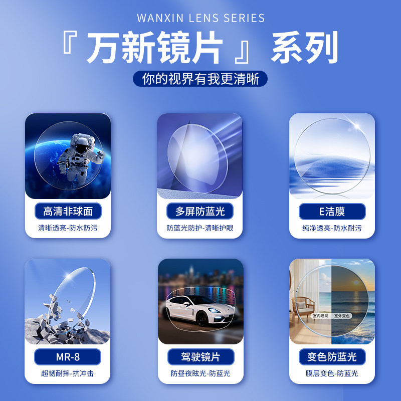 万新镜片1.74超薄高度近视眼镜片防蓝光非球面1.60变色片1.67