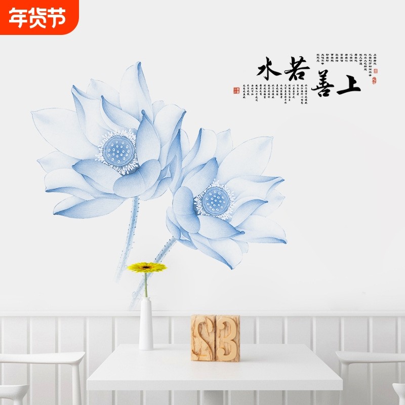 GS9128中国风莲花贴画电视背景墙贴卧室墙壁贴纸可移除自粘贴花