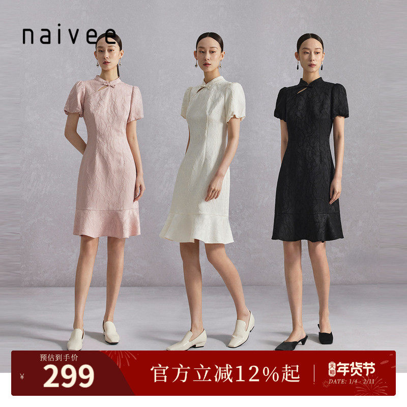 naivee纳薇新中式改良旗袍夏短袖国风盘扣提花连衣裙女赴宴轻礼服