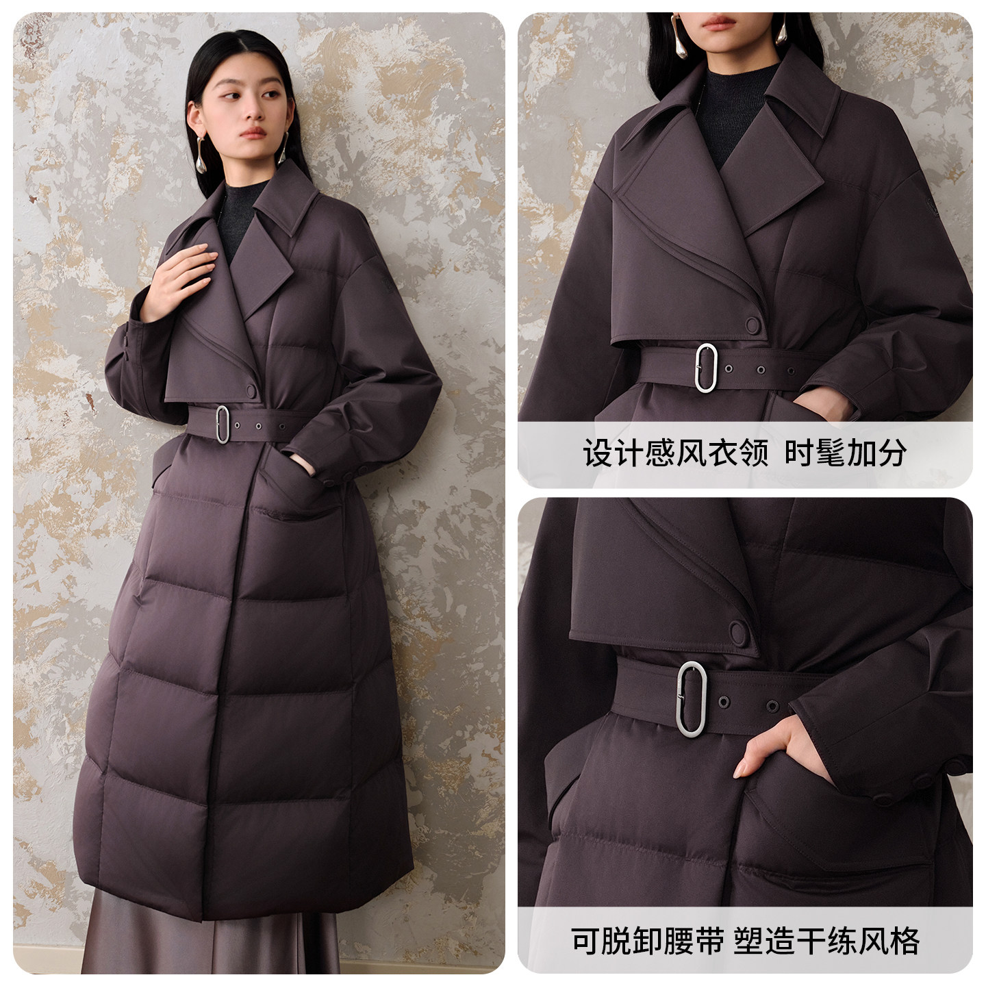 设计感风衣领、可脱卸腰带、远红外升温
