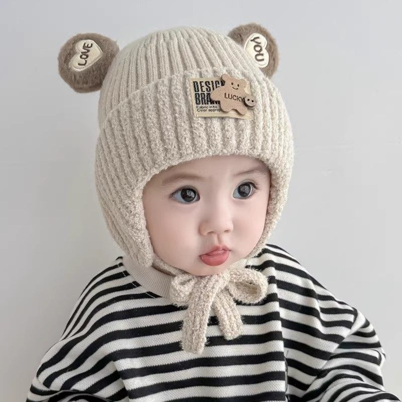 hugz儿童帽子围巾秋冬户外男孩女孩保暖针织毛线帽护耳防风熊仔帽