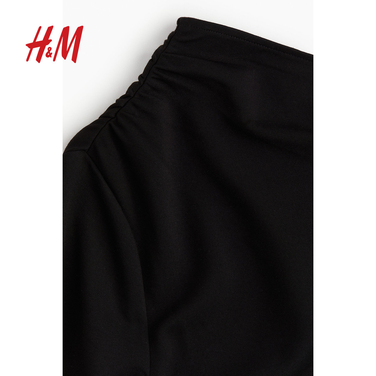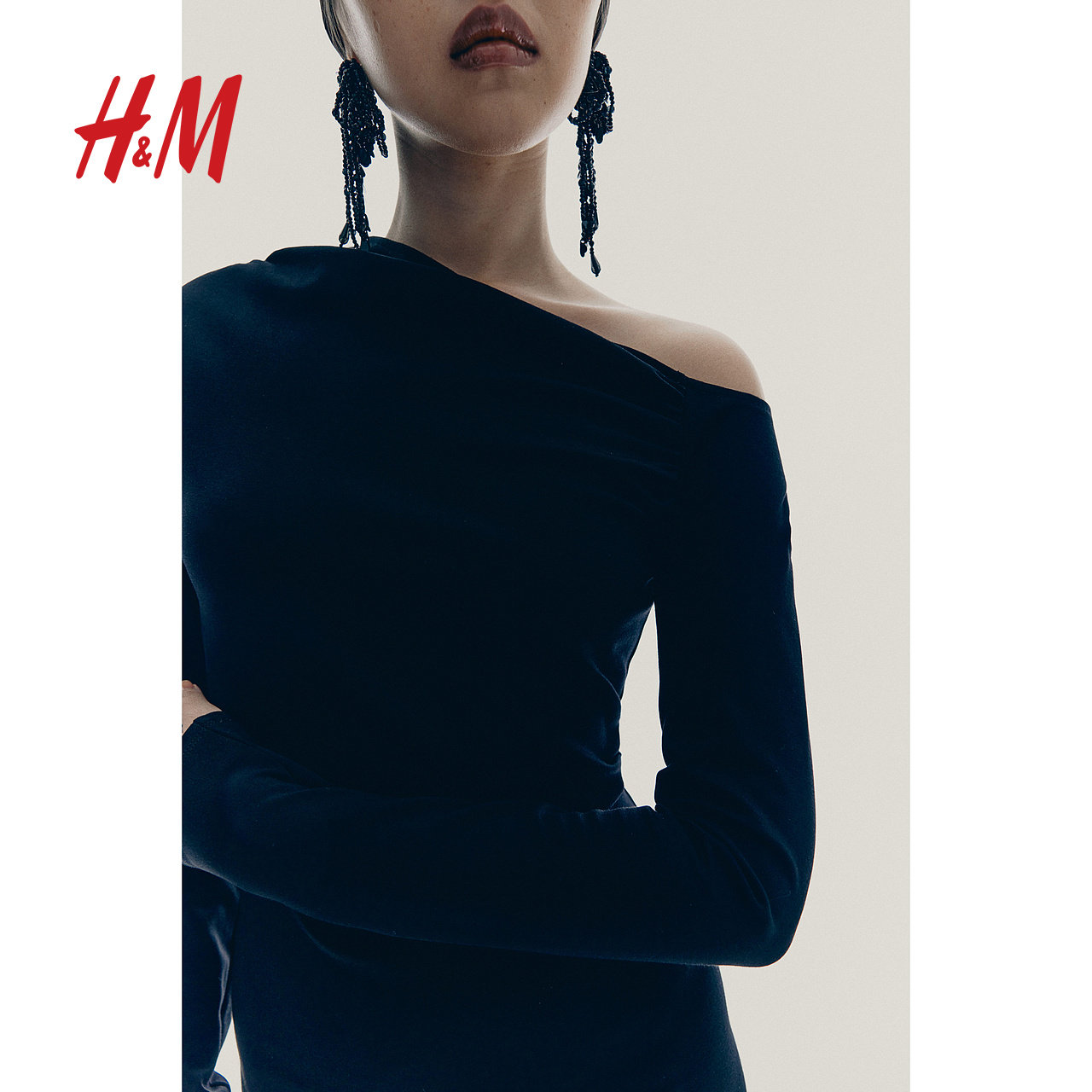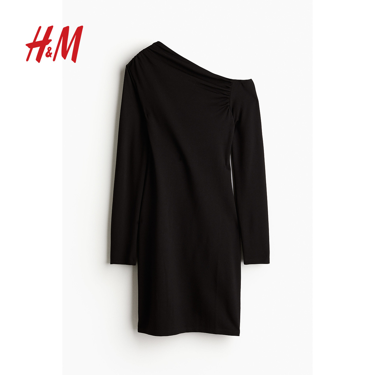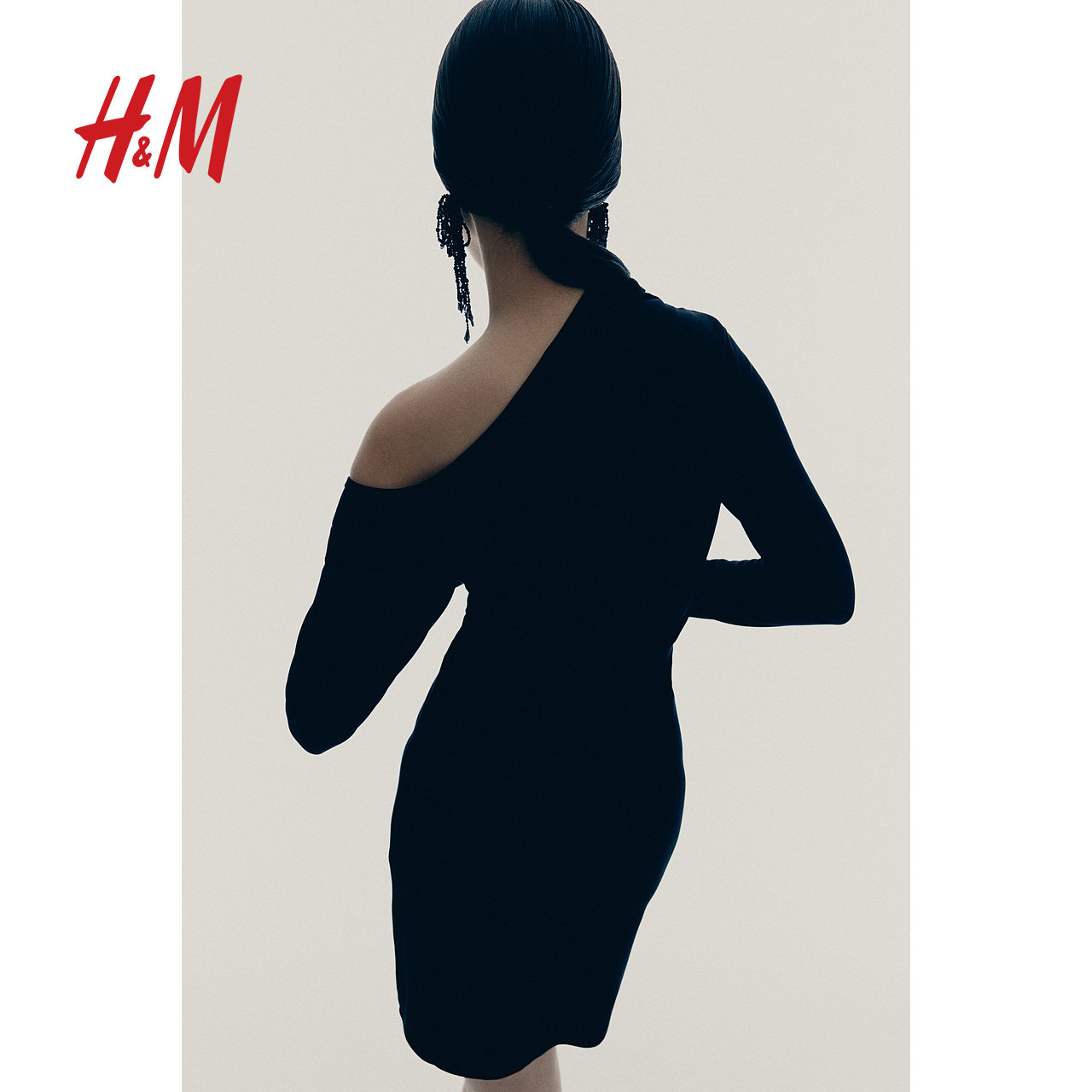 HM女装连衣裙冬季修身优雅单肩紧身重磅长袖短裙1261730