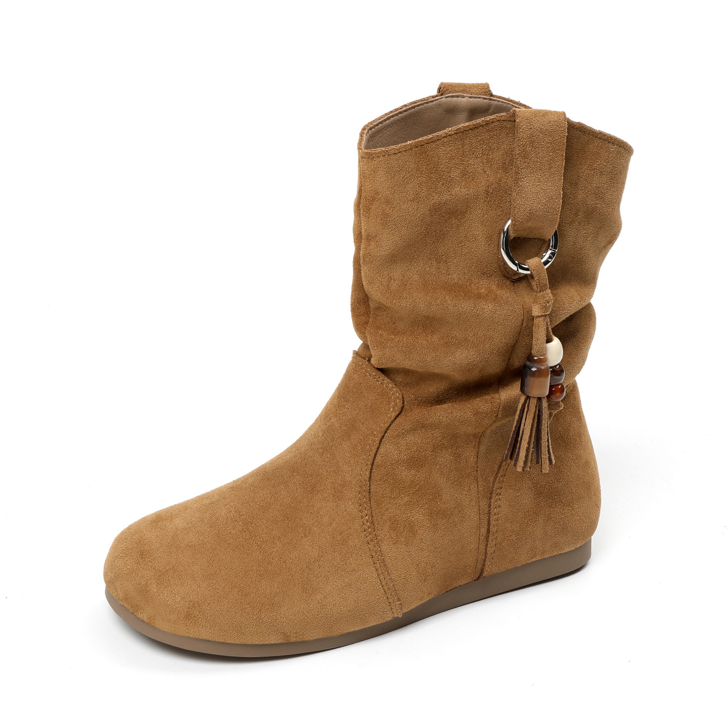 真皮~棕色西部堆堆靴女2025秋冬平底勃肯短靴圆头马丁靴大码女靴