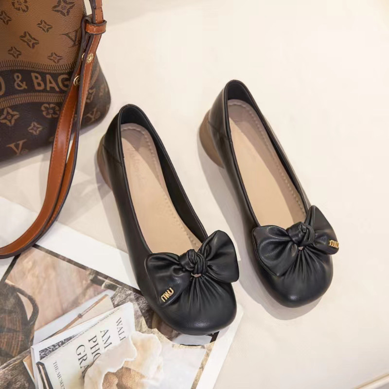 春达单鞋女2025新款软皮蝴蝶结舒适一脚蹬纯色配裙子浅口复古鞋潮