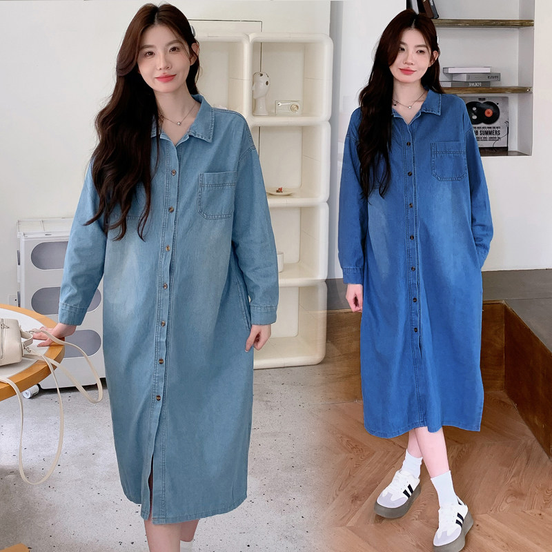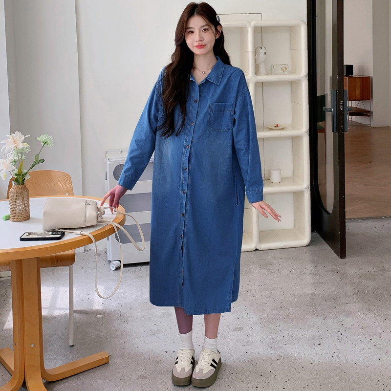 婧麒孕妇牛仔连衣裙秋季洋气遮肚裙子新款宽松开扣长裙孕期牛仔裙