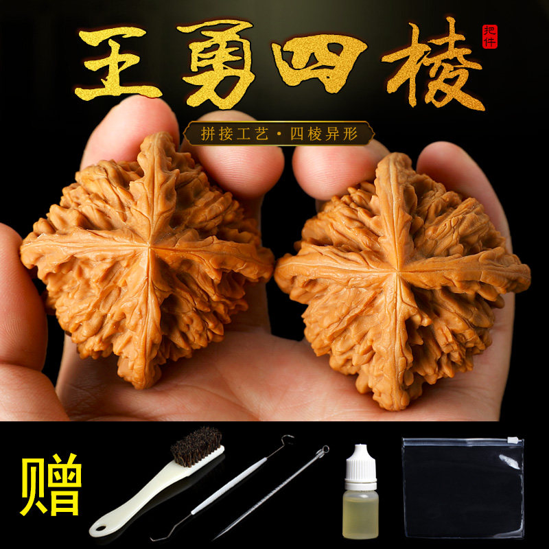 文玩核桃麒麟纹官帽四棱拼接筋异形核桃古玩盘玩手把件男狮子头