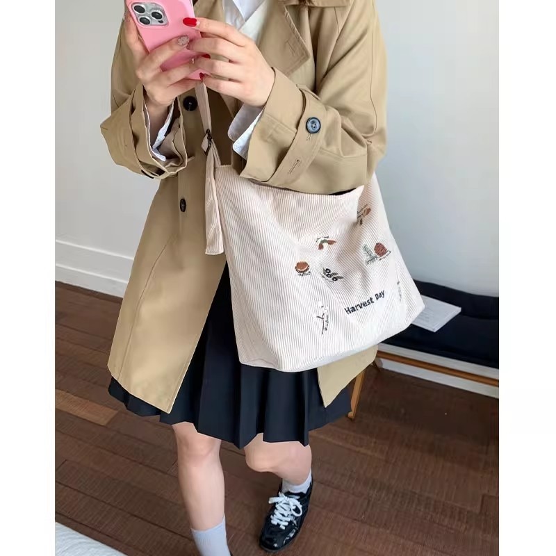 条绒刺绣帆布包包女大容量单肩通勤腋下包小众学生百搭斜挎托特包