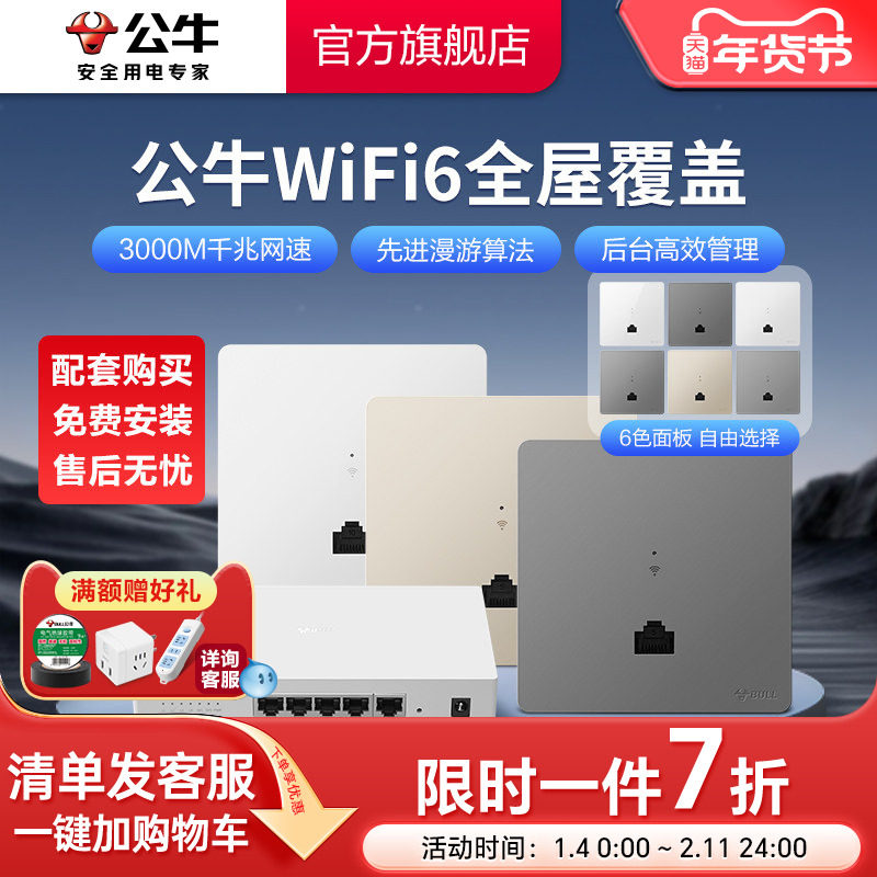 公牛千兆86型无线ap面板家用别墅WIFI6路由器入墙壁式POE一体供电全屋覆盖插座套装
