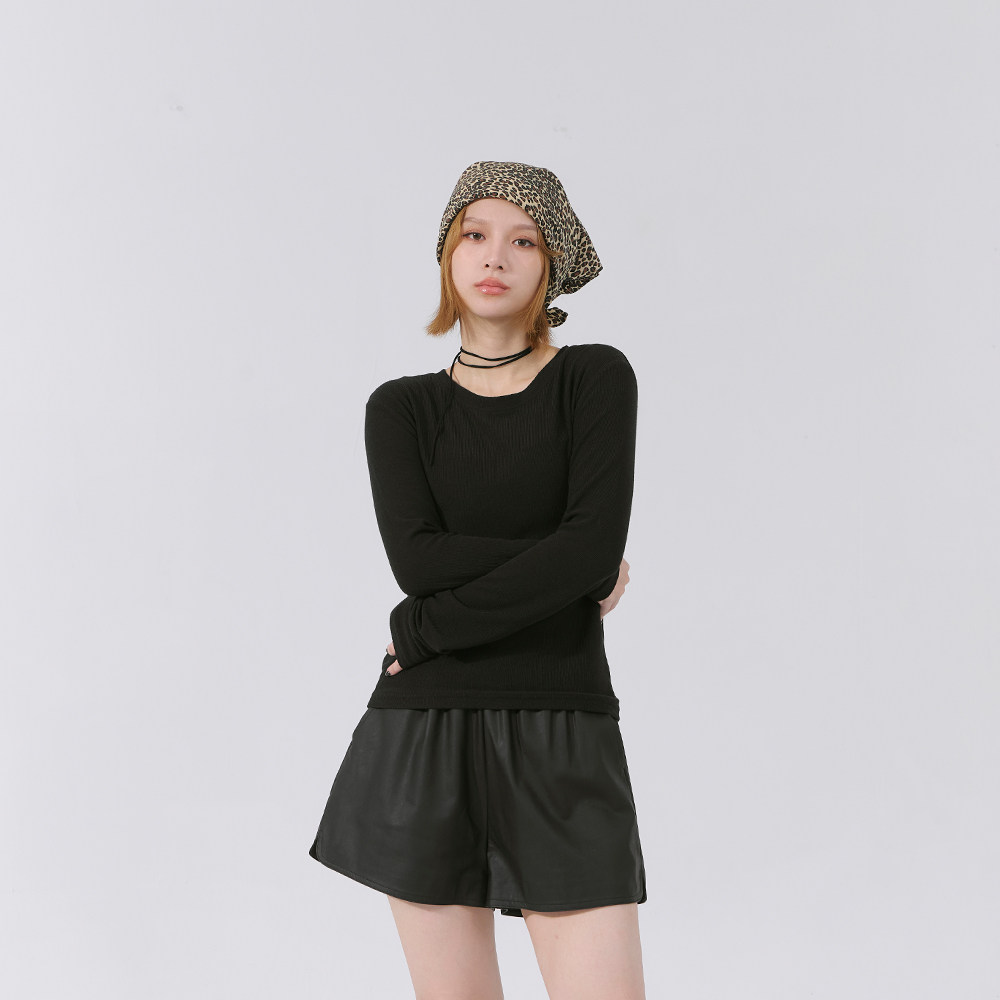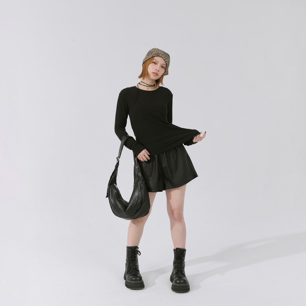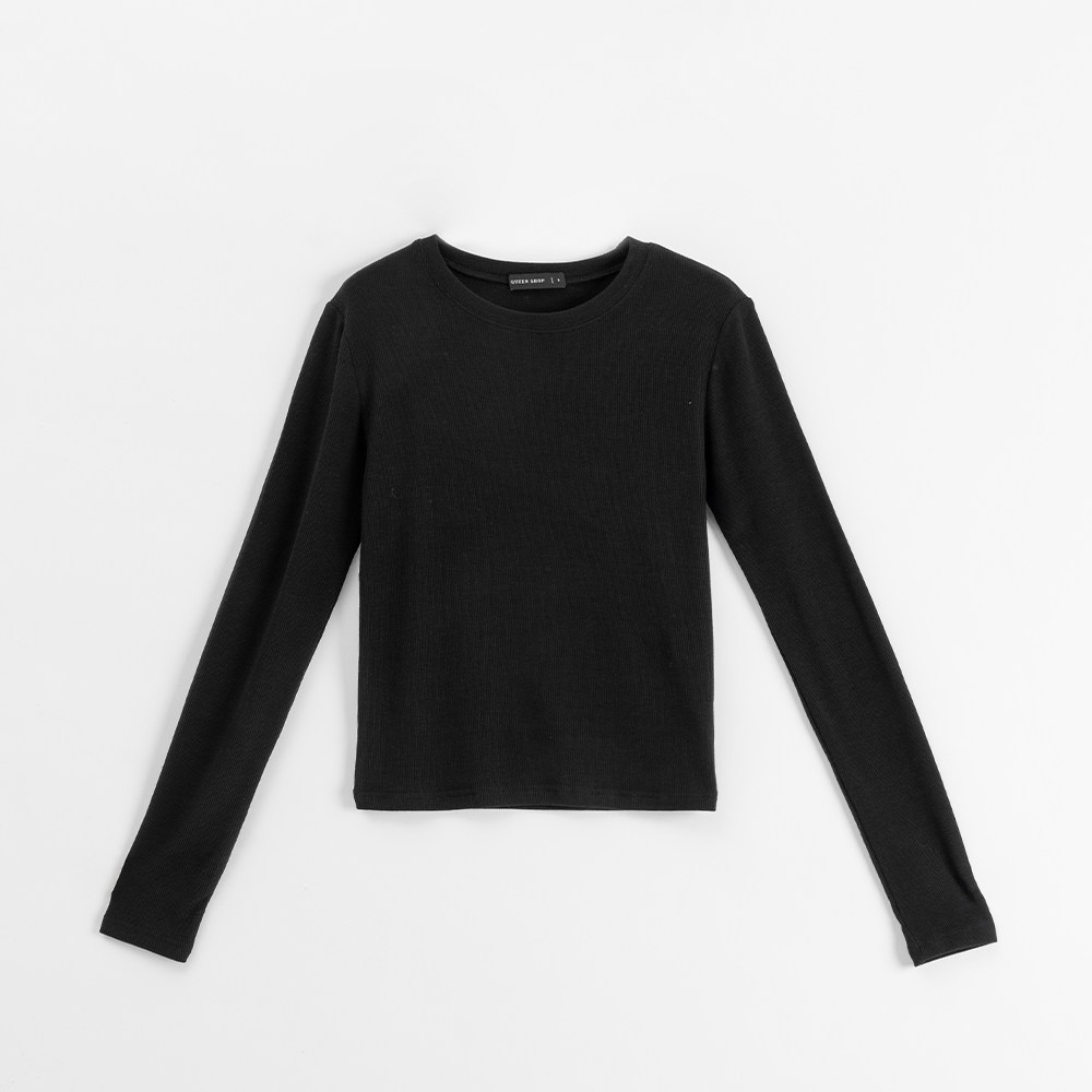 QUEENSHOP 2025秋冬新品女装简约坑条感弹性圆领上衣-黑01099342