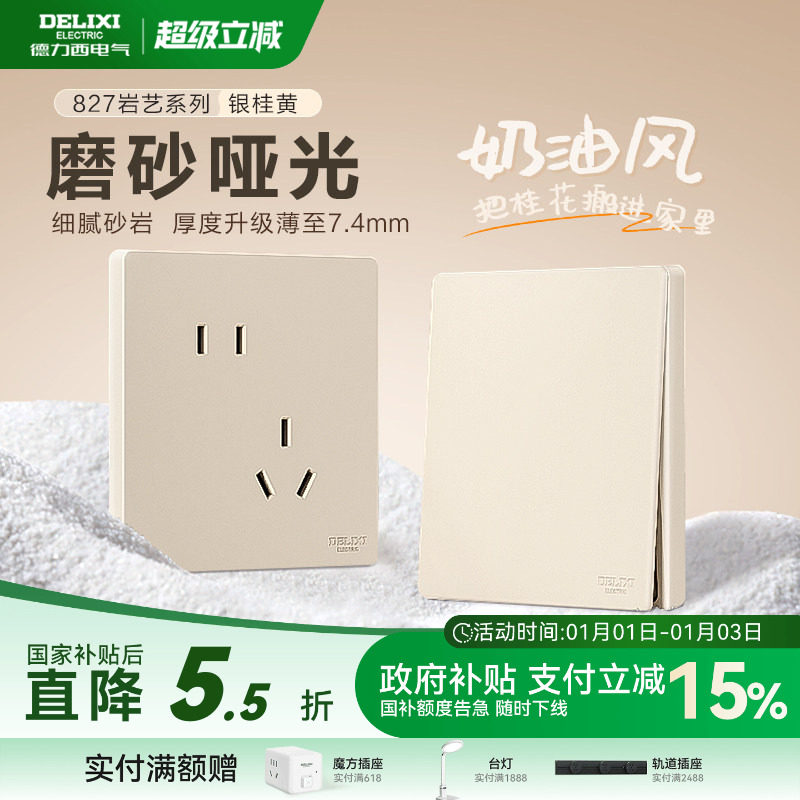 德力西旗舰店827奶油风哑光开关五孔插座空调16A面板银桂黄