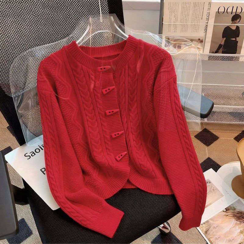 大码女装微胖纯色圆领针织衫新年红色毛衣外套外穿内搭针织衫上衣