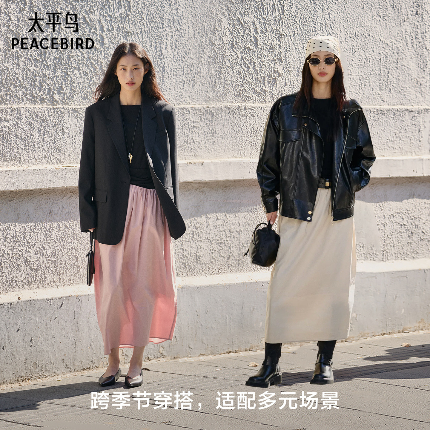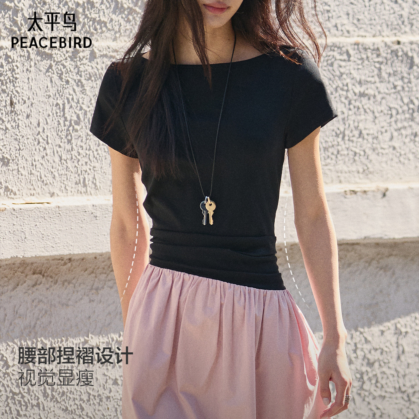 太平鸟郁金香花苞连衣裙假两件春装新款船领通勤连身裙品质感短袖