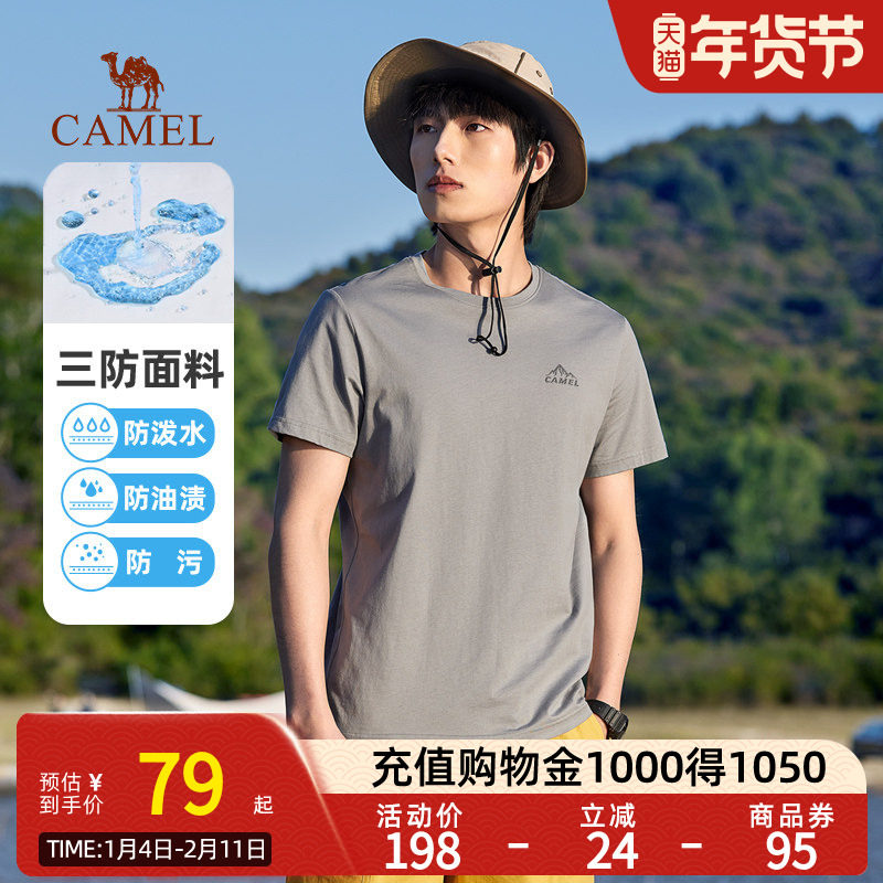 Camel骆驼男装三防短袖t恤夏美式圆领纯棉纯色半袖体恤打底衫