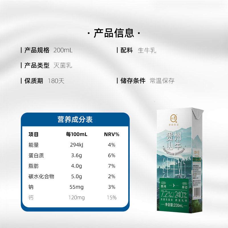 认养贵州山牛纯牛奶200ml*16盒*2箱3.6g蛋白纯奶全脂儿童牛奶
