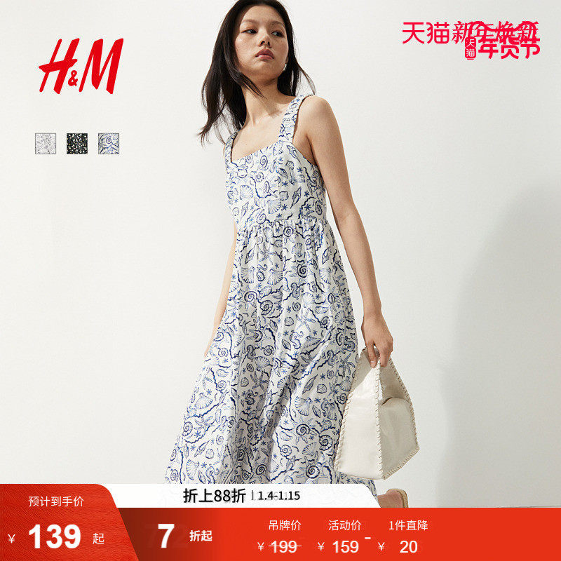 HM女装无领连衣裙春季方领法式喇叭印花吊带设计感碎花裙1287798