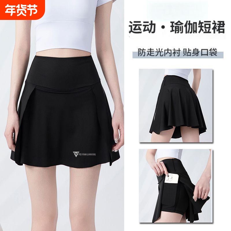 运动短裙女夏季防走光户外羽毛球网球裙百褶假两件高腰收腹瑜伽裙