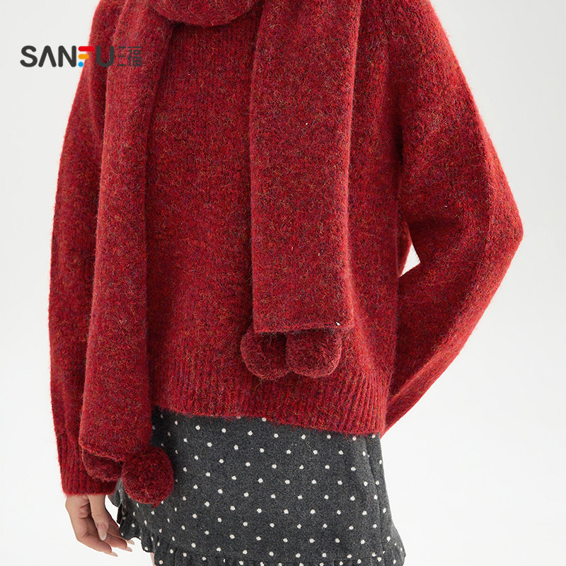 三福毛衣冬季女2025新款毛球围巾圆领宽松时尚休闲上衣女装513495
