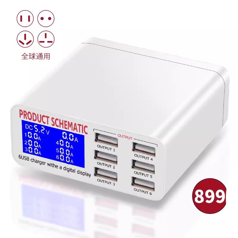 6口智能充电器QC3.0显示电流电压多USB口充电排插6USB多口快充头
