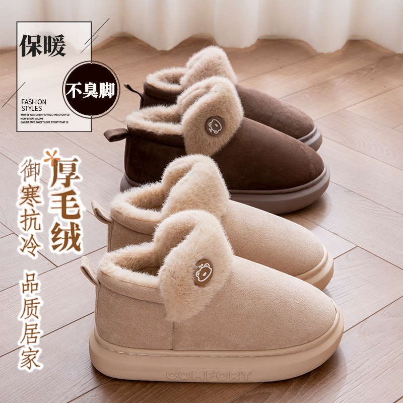 高帮毛棉拖鞋男女包跟秋冬季情侣室内有带后跟棉鞋厚底居家用保暖