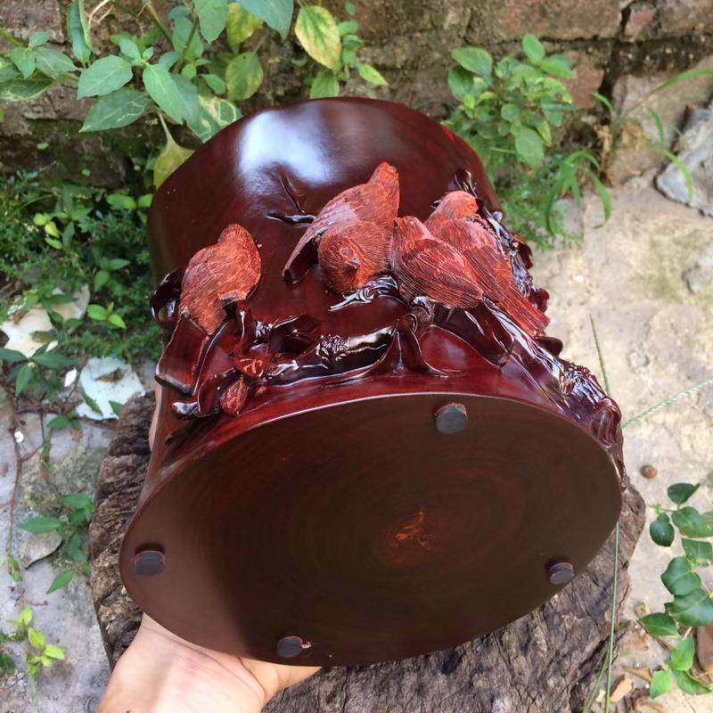 赞比亚血檀木质笔筒圆形 实木雕刻五雀图工艺品摆件 厂家直销
