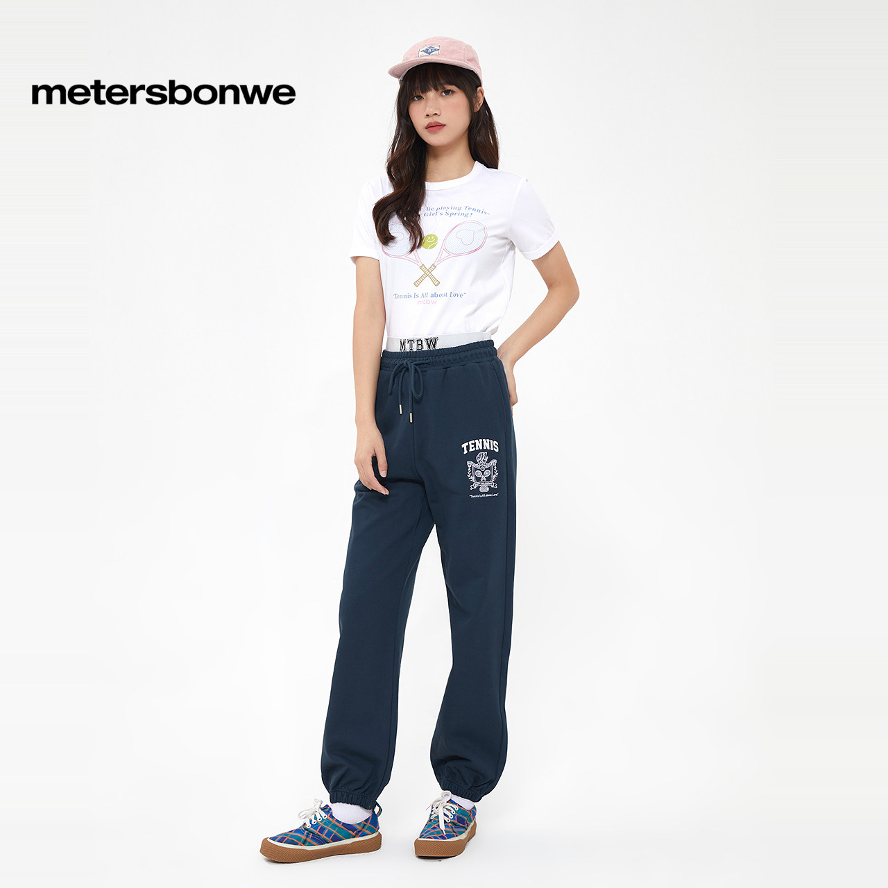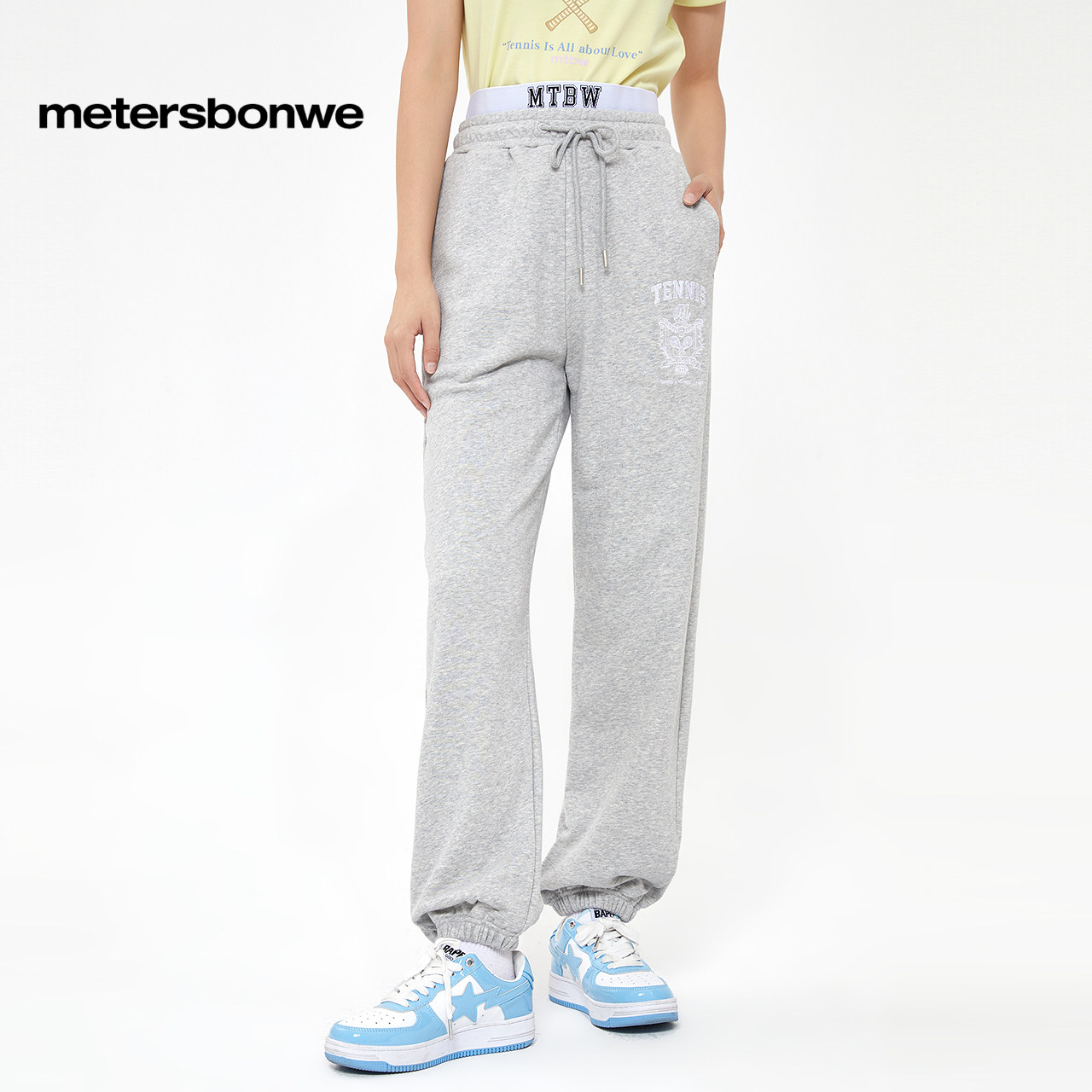 美特斯邦威运动裤女春季新款绣花束脚舒适高腰卫裤下装纯棉长裤子