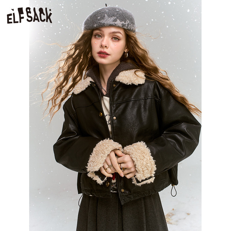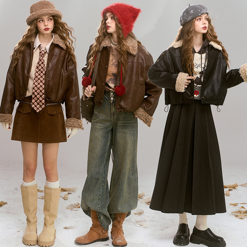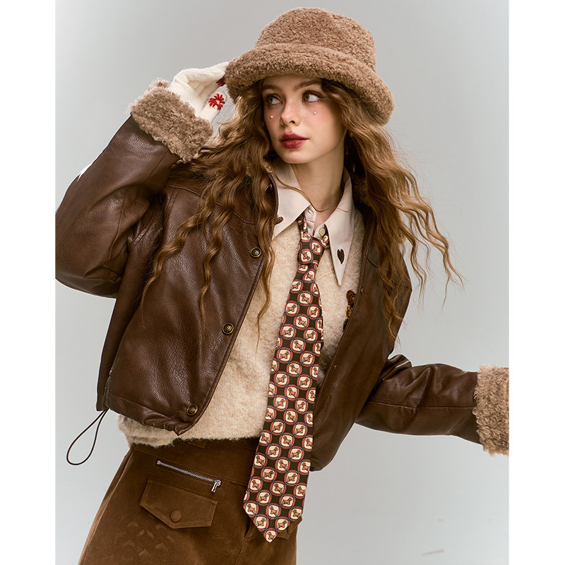 妖精的口袋仿羊羔毛拼接复古咖色皮衣外套女2025年秋冬新款学院风
