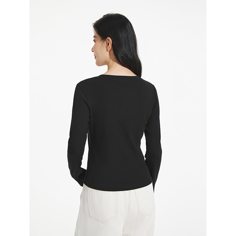 热风女士长袖T恤上衣2025年秋季新款修身小V领T恤黑色内搭打底衫