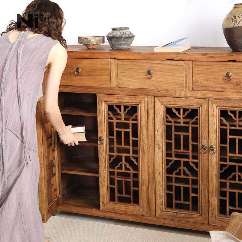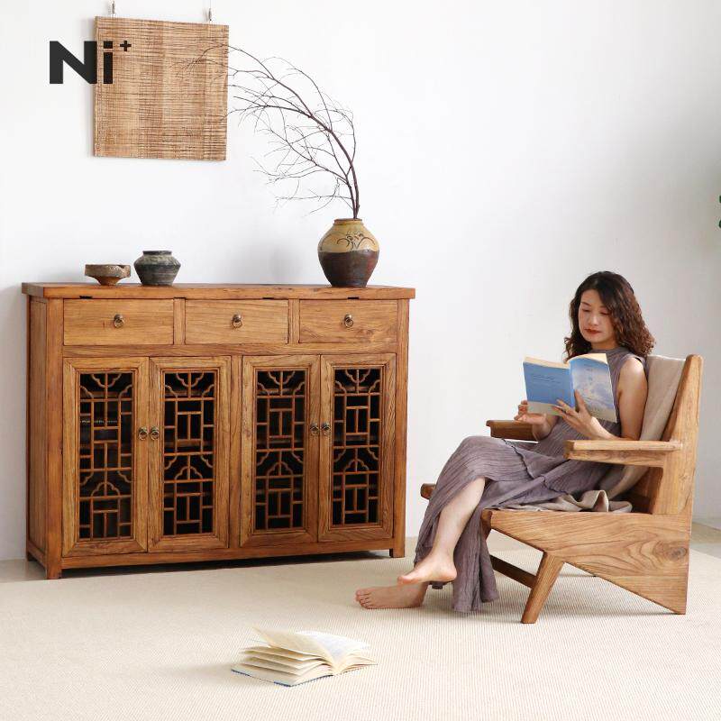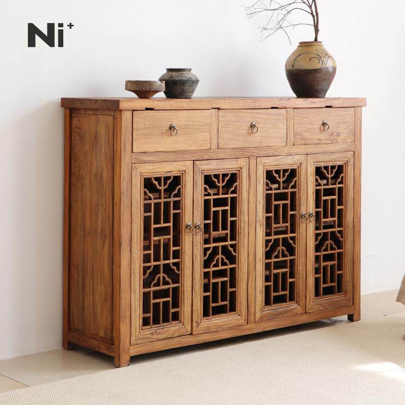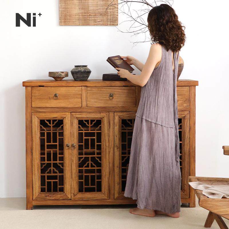 Ni尼家侘寂风实木餐边柜复古风茶室柜子榆木雕花窗镂空老中式边柜