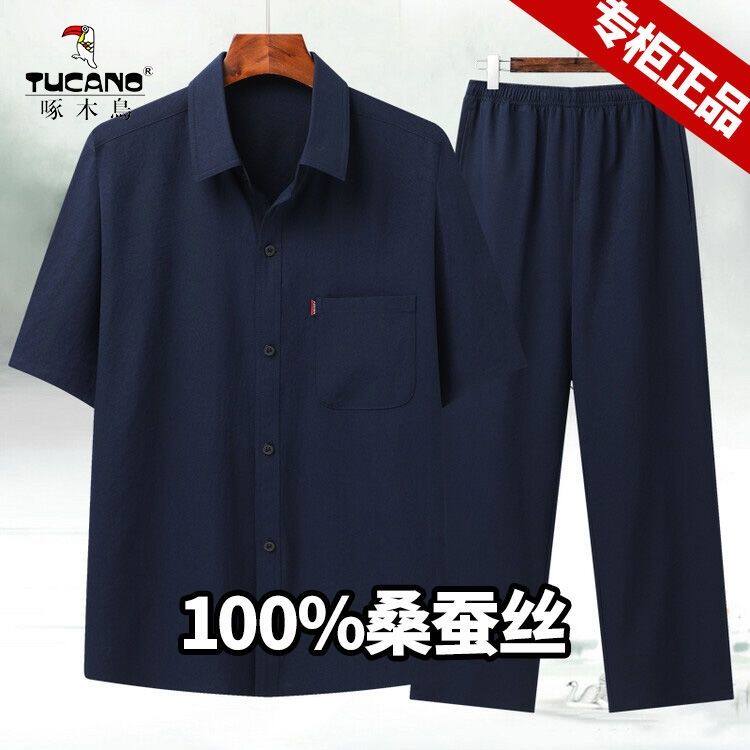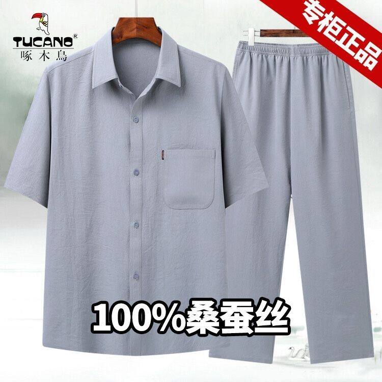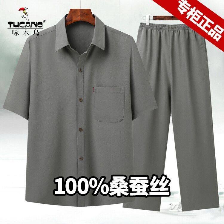 啄木鸟中老年夏季桑蚕丝高档男士短袖衬衫爸爸装免烫抗皱父亲套装
