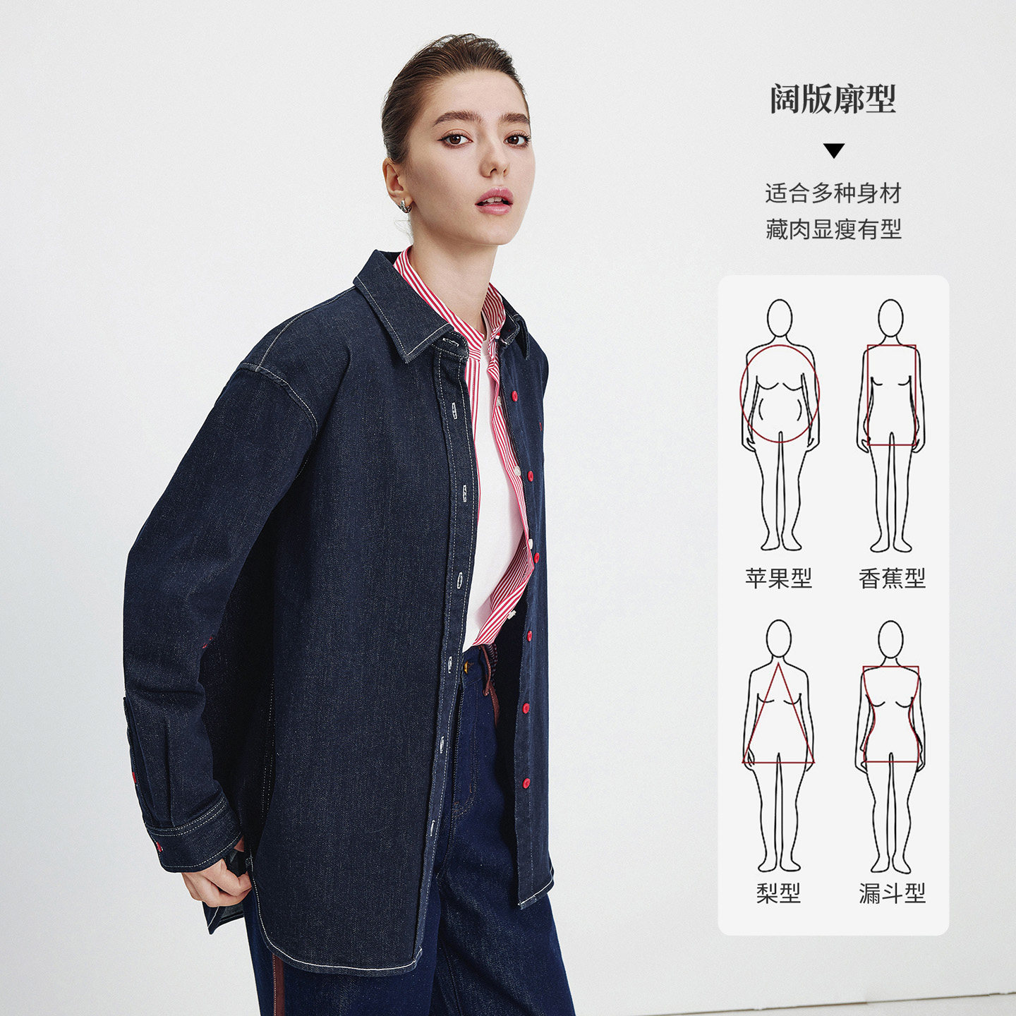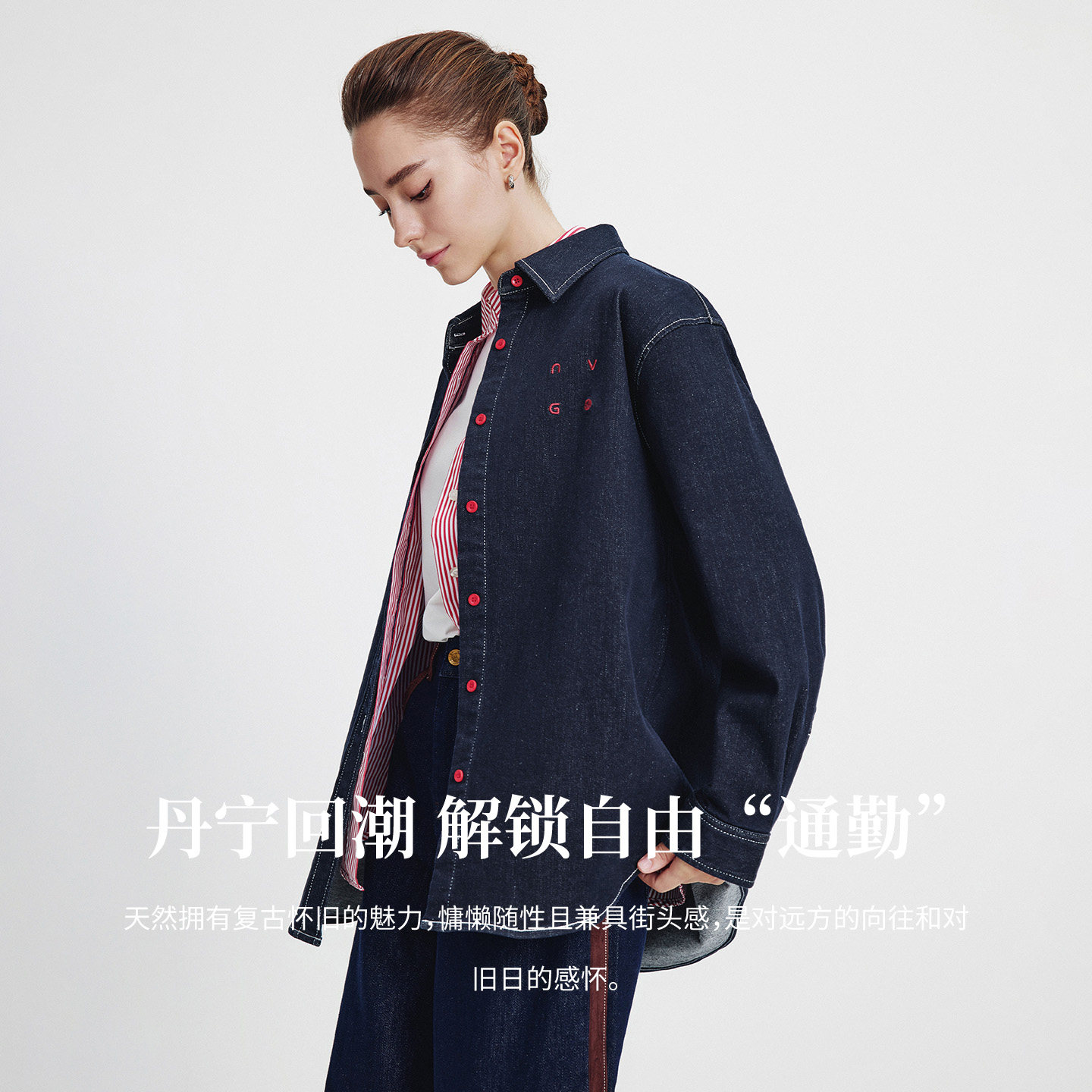 Navigare意大利小帆船宽松长袖衬衫女士春秋季新款尖领通勤牛仔服