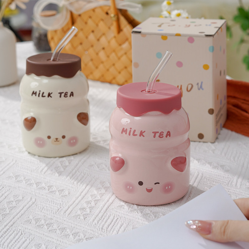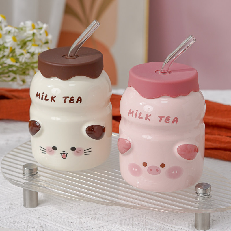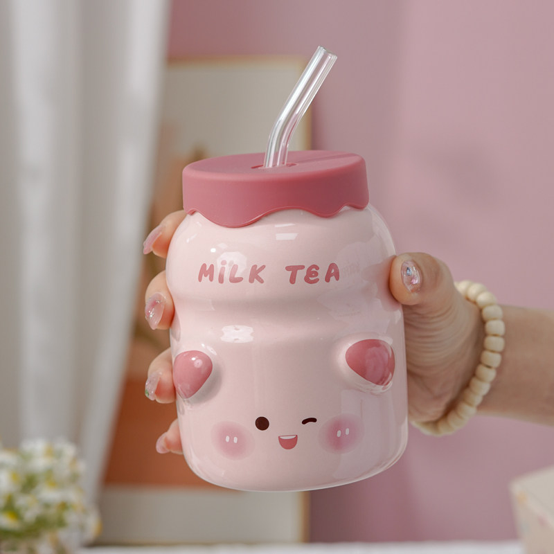 陶瓷酸奶杯儿童粉嫩少女心吸管杯生日礼物带盖水杯可爱大容量学生