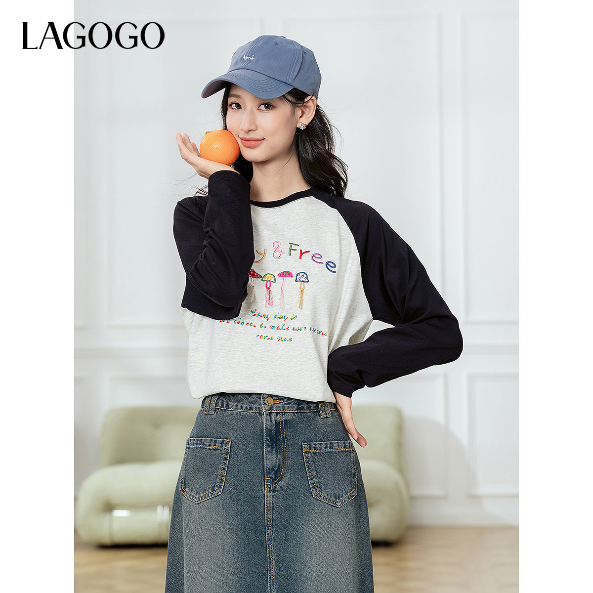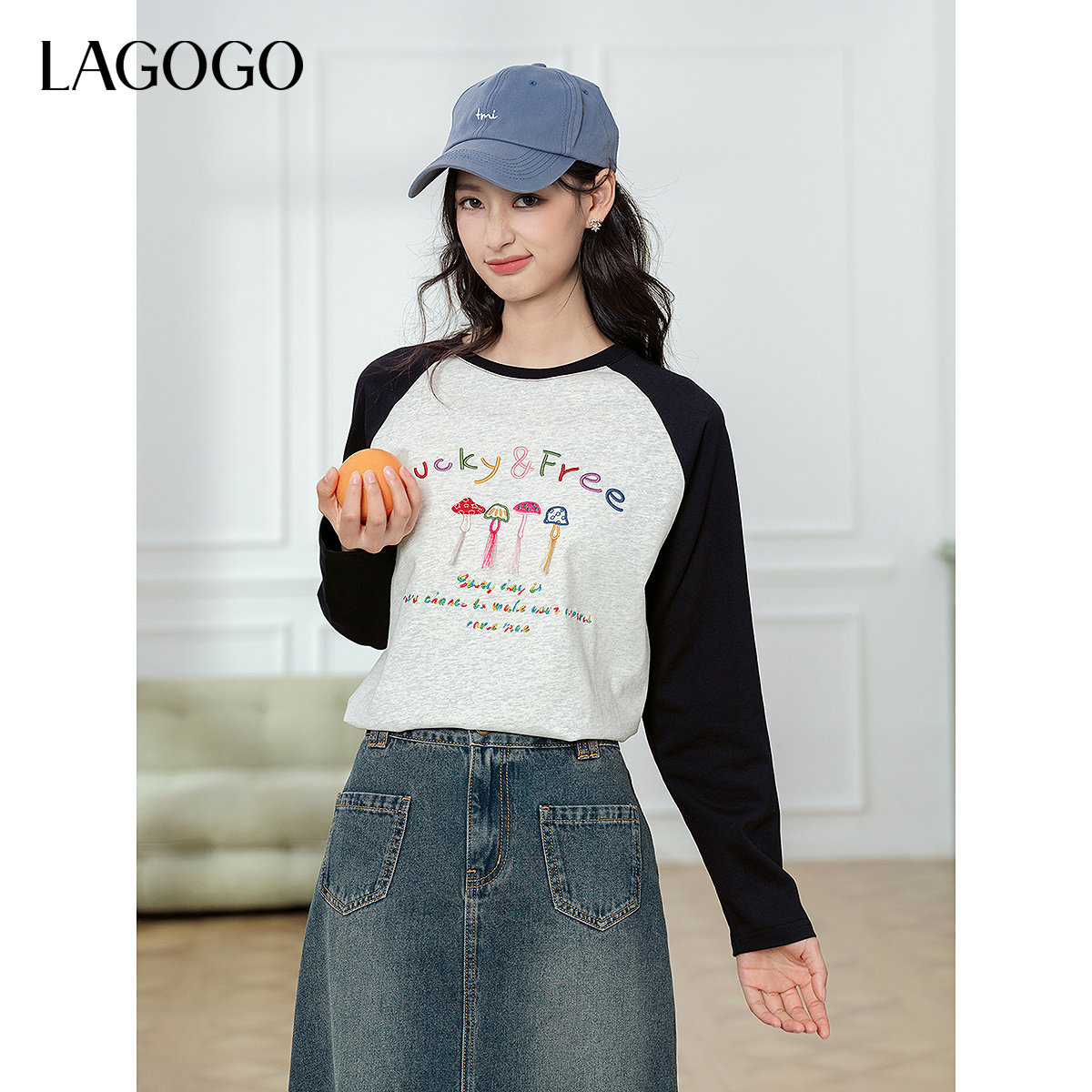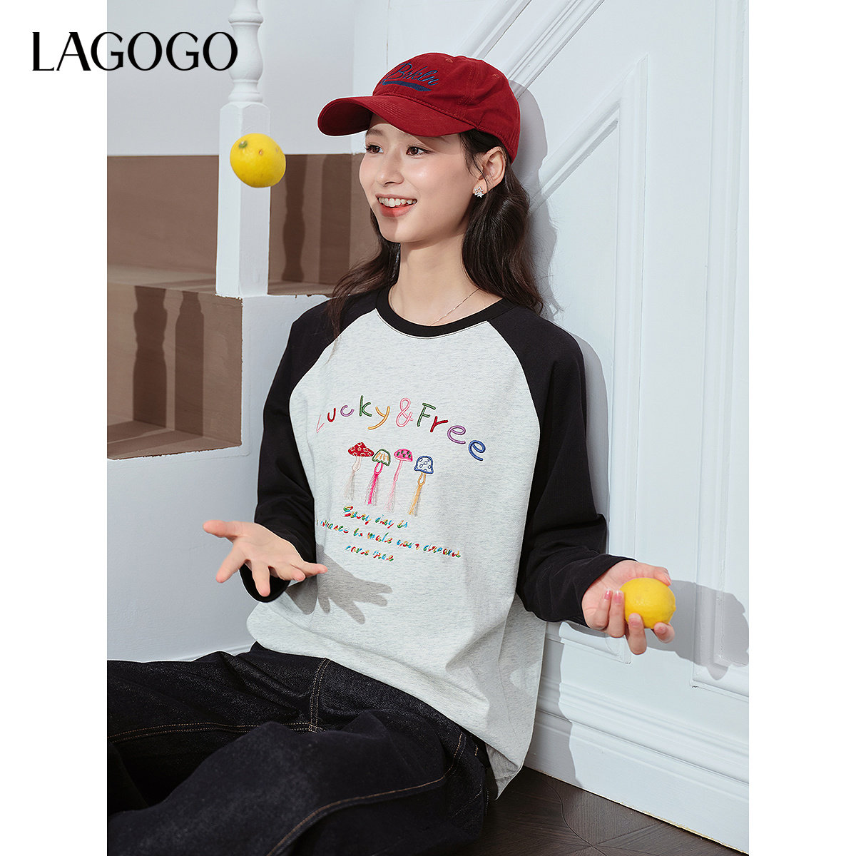LAGOGO彩虹蘑菇插肩袖通勤T恤女拉谷谷2026春新款纯棉宽松上衣