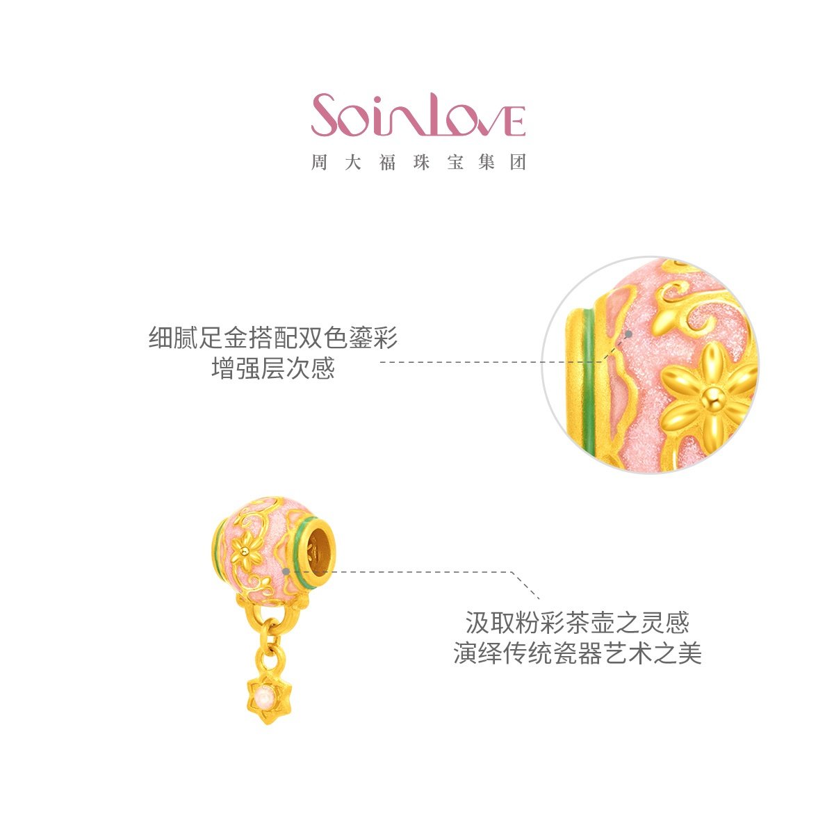 周大福SOINLOVE蜜粉金十里红妆粉彩宝相黄金转运珠配绳圣诞礼物