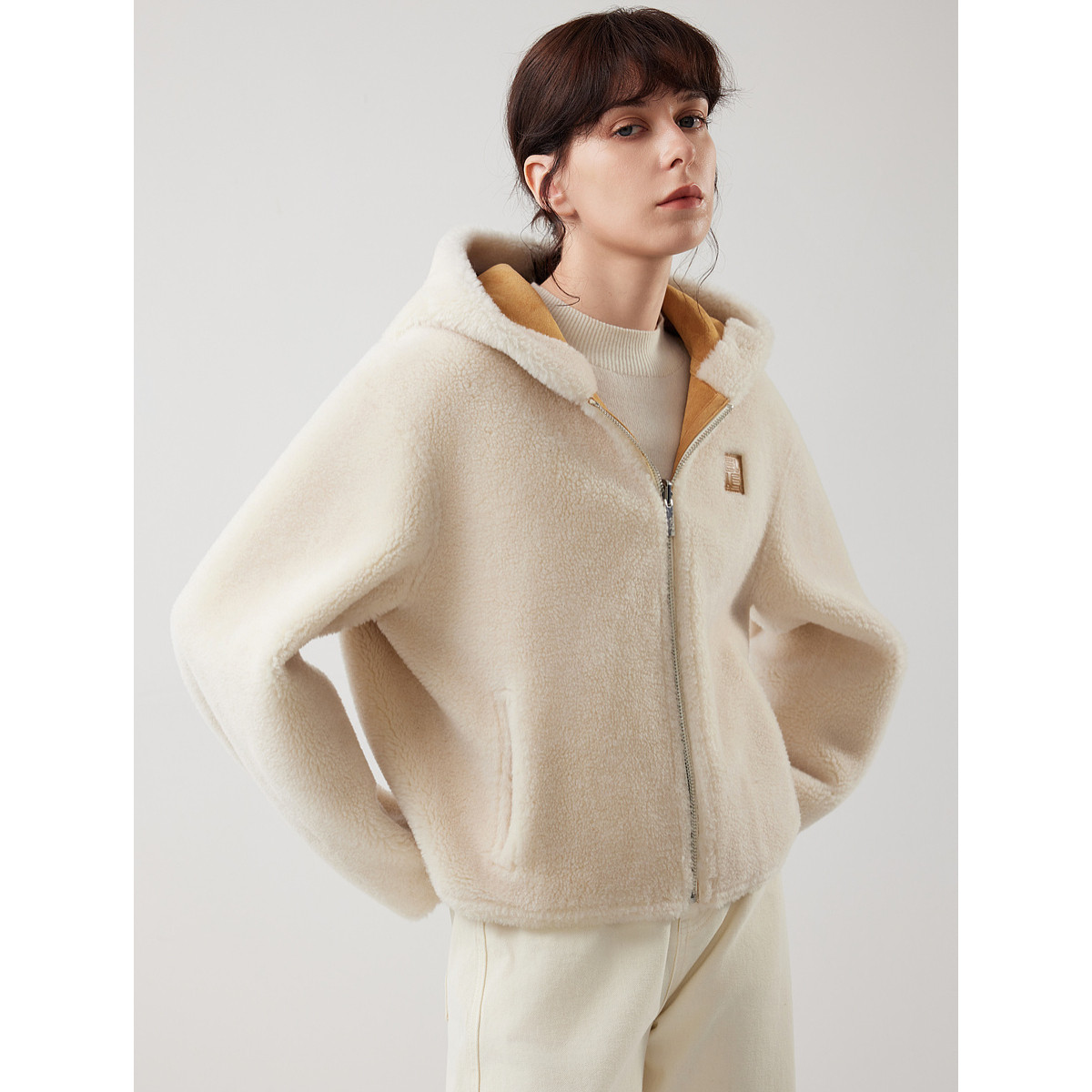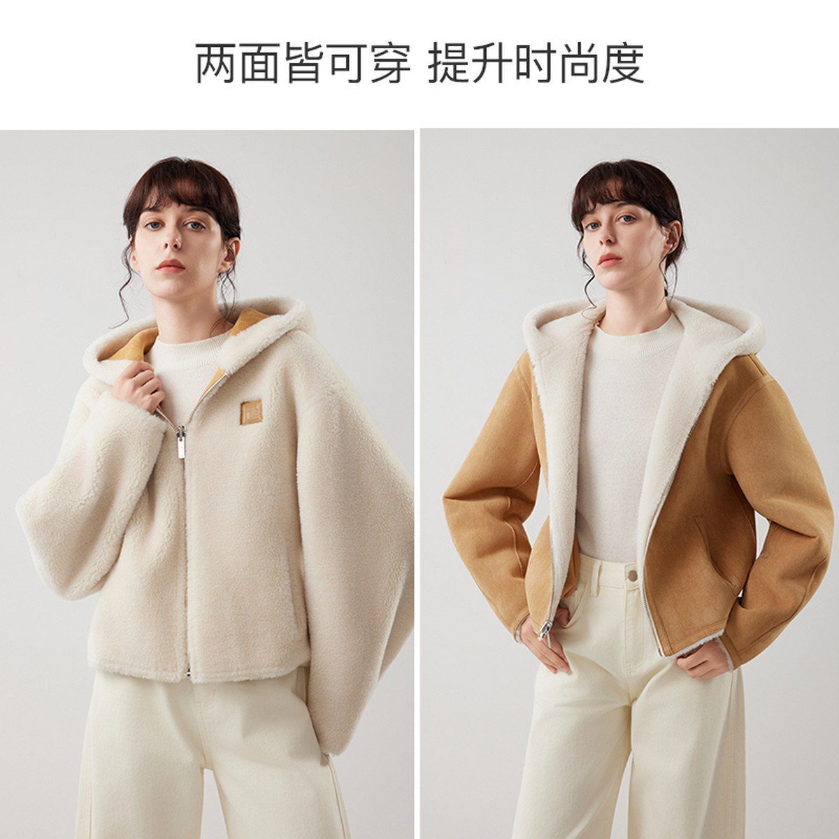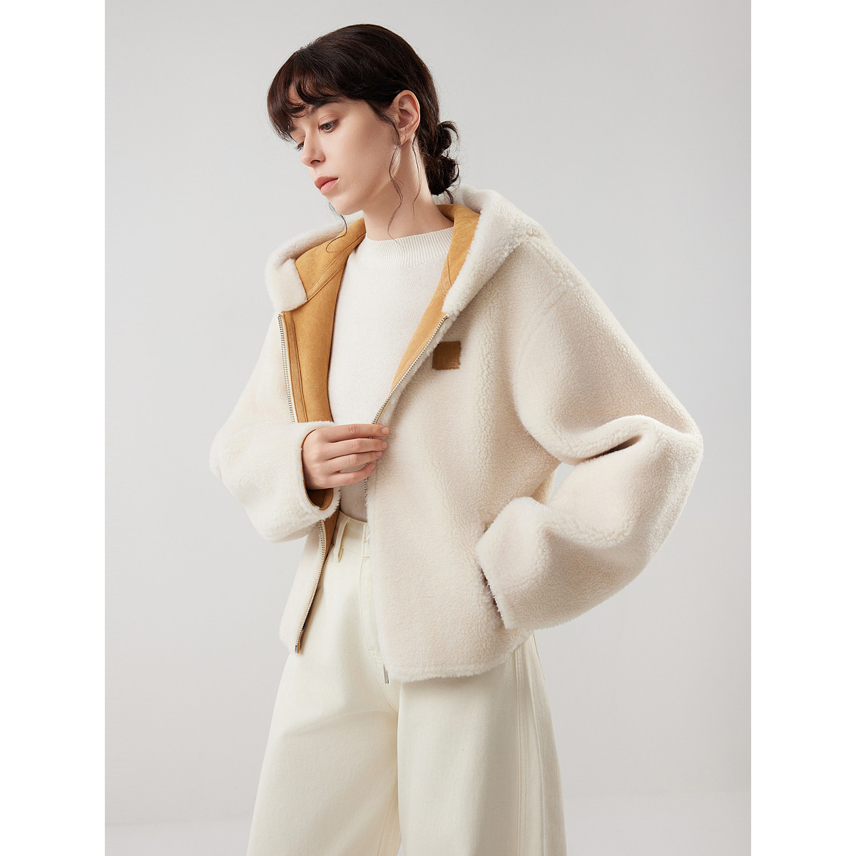 ELLE法式皮毛一体绵羊毛连帽短外套女2025冬季新款宽松羊羔毛上衣