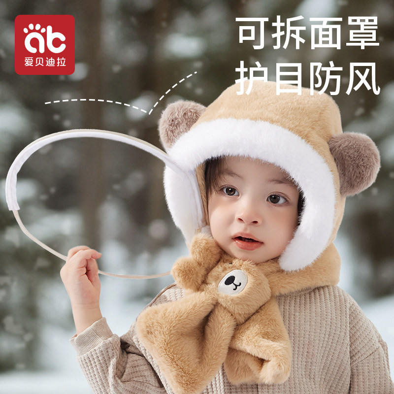 尼多熊儿童帽子围巾一体冬季防风帽宝宝毛绒护耳帽女童加厚保暖帽