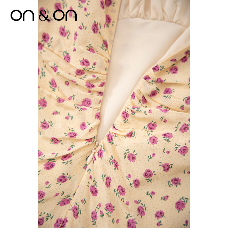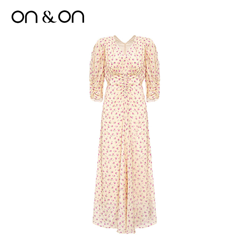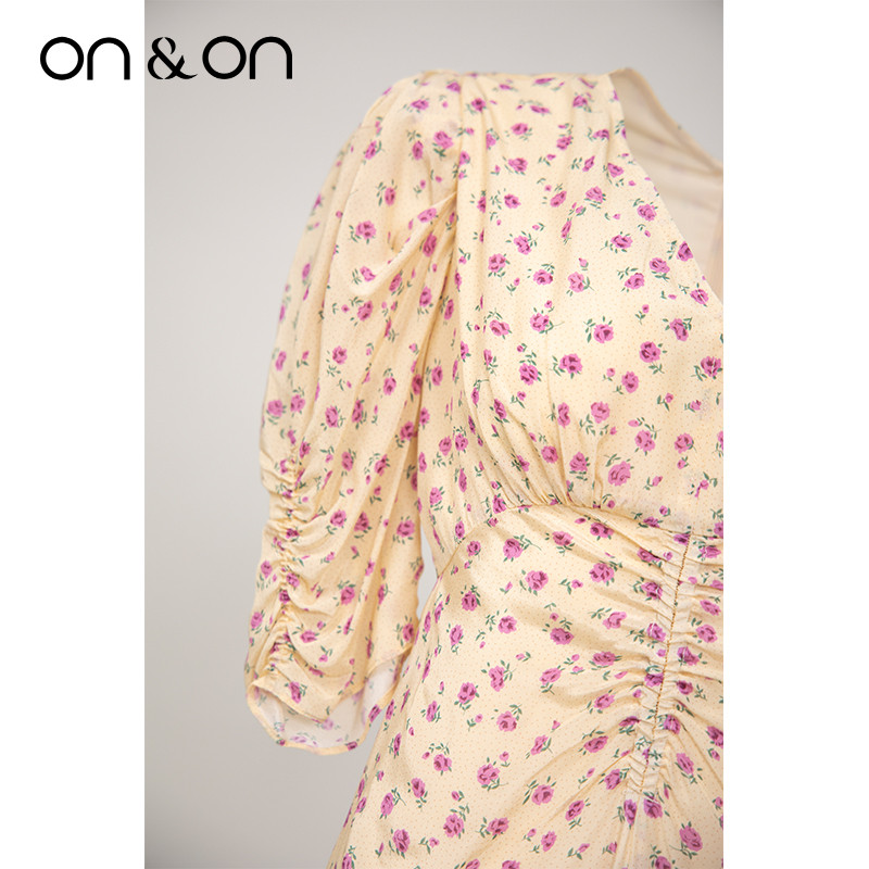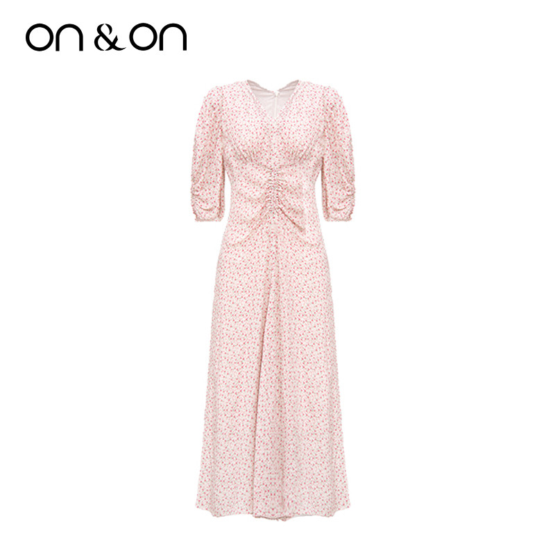 ON&ON/安乃安夏季出游时尚V领女士抽褶气质减龄真丝桑蚕丝连衣裙